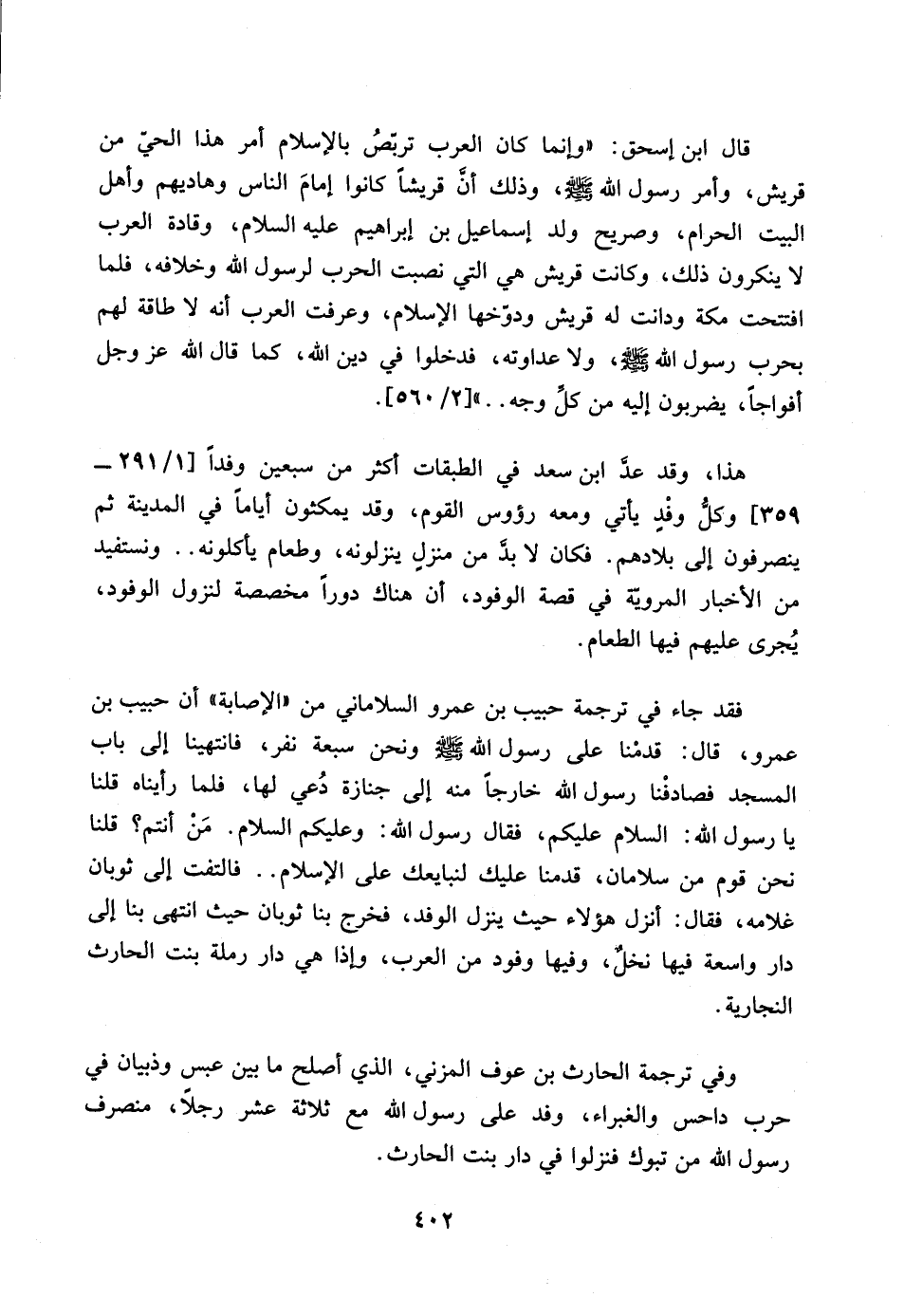 قال ابن إسحق: ((وإنما كان العرب تربص بالإسلام أمر هذا الحي من قريش، وأمر رسول الله صلى الله عليه وسلم، وذلك أن قريش كانوا إمام الناس وهاديهم وأهل البيت الحرام، وصريح ولد إسماعيل بن إبراهيم عليه السلام، وقادة العرب لا ينكرون ذلك، وكانت قريش هي التي نصبت الحرب لرسول الله وخلافه، فلما افتتحت مكة ودانت له قريش ودوخها الإسلام، وعرفت العرب أنه لا طاقة لهم بحرب رسول الله صلى الله عليه وسلم، ولا عداوته، فدخلوا في دين الله، كما قال الله عز وجل أفواجا، يضربون إليه من كل وجه .. )) [2/ 560].