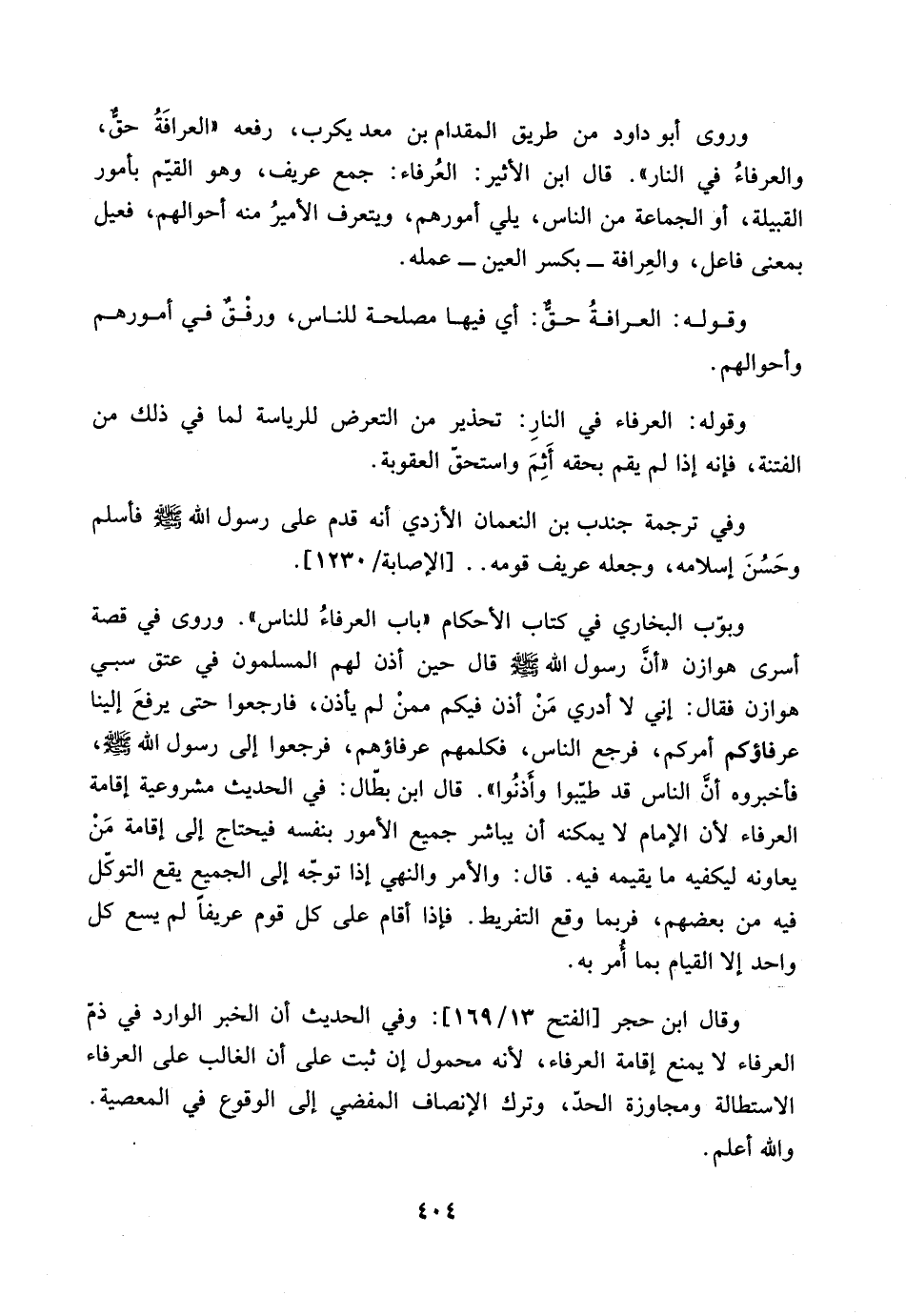 وقال ابن حجر [الفتح 13/ 169]: وفي الحديث أن الخبر الوارد في ذم العرفاء لا يمنع إقامة العرفاء، لأنه محمول إن ثبت على أن الغالب على العرفاء الاستطالة ومجاوزة الحد، وترك الإنصاف المفضي إلأى الوقوع في المعصية.