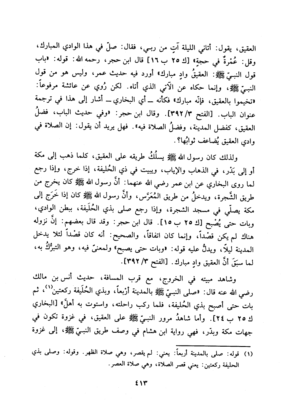 ولذلك كان رسول الله صلى الله عليه وسلم يسلك طريقه على العقيق، كلما ذهب الى مكة او الى بدر، في الذهاب والاياب، ويبيت في ذي الحليفة، اذا خرج، واذا رجع لما روى البخاري عن ابن عمر رضي الله عنهما: ان رسول الله صلى الله عليه وسلم كان يخرج من طريق الشجرة، ويدخل من طريق المعرس، وان رسول الله صلى الله عليه وسلم كان اذا خرج الى مكة يصلي في مسجد الشجرة، واذا رجع صلى بذي الحليفة، ببطن الوادي، وبات حتى يصبح [ك 25 ب 15].