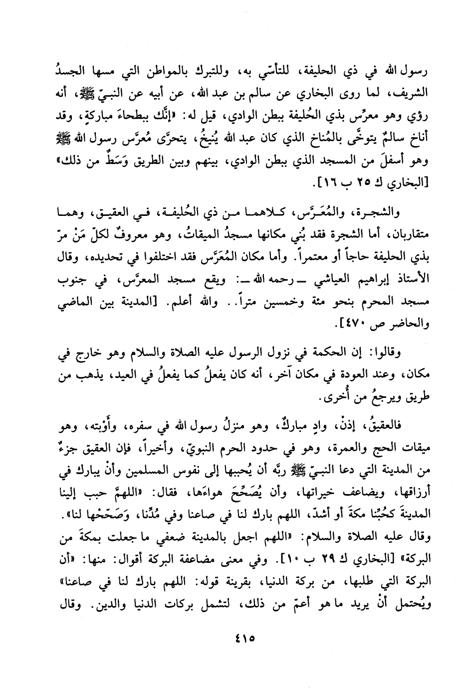 فالعقيق، اذن واد مبارك، وهو منزل رسول الله في سفره، واوبته، وهو ميقات الحج والعمرة، وهو في حدود الحرم النبوي، واخيراً، فان العقيق جزء من المدينة التي دعا النبي صلى الله عليه وسلم ربه ان يحببها الى نفوس المسلمين وان يبارك في أرزاقها، ويضاعف خيراتها، وان يصحح هواءها، فقال: ((اللهم حبب الينا المدينة كحبنا مكة او اشد، اللهم بارك لنا في صاعنا وفي مدنا، وصححها لنا)). وقال عليه الصلاة والسلام: ((اللهم اجعل بالمدينة ضعفي ما جعلت بمكة من البركة)) [البخاري ك 29 ب 10]. وفي معنى مضاعفة البركة أقوال: منها: ((أن البركة التي طلبها، من بركة الدنيا، بقرينة قوله: اللهم بارك لنا في صاعنا)) ويحتمل ان يريد ما هو أعم من ذلك، لتشمل بركات الدنيا والدين. وقال…