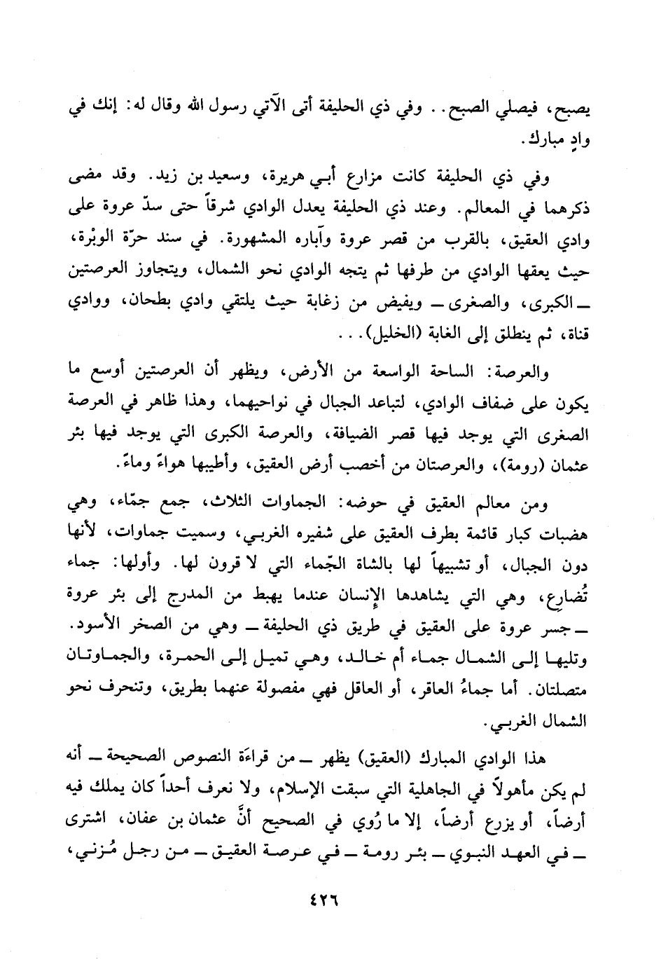 وفي ذي الحليفة كانت مزارع ابي هريرة، وسعيد بن زيد. وقد مضى ذكرهما في المعالم. وعند ذي الحليفة يعدل الوادي شرقاً حتى سد عروة على وادي العقيق، بالقرب من قصر عروة وآباره المشهورة. في سند حرة الوبرة، حيث يعقها الوادي من طرفها ثم يتجه الوادي نحو الشمال، ويتجاوز العرصتين ـ الكبرى، والصغرى ـ ويفيض من زغابة حيث يلتقي وادي بطحان، ووادي قناة، ثم ينطلق الى الغابة (الخليل) ...