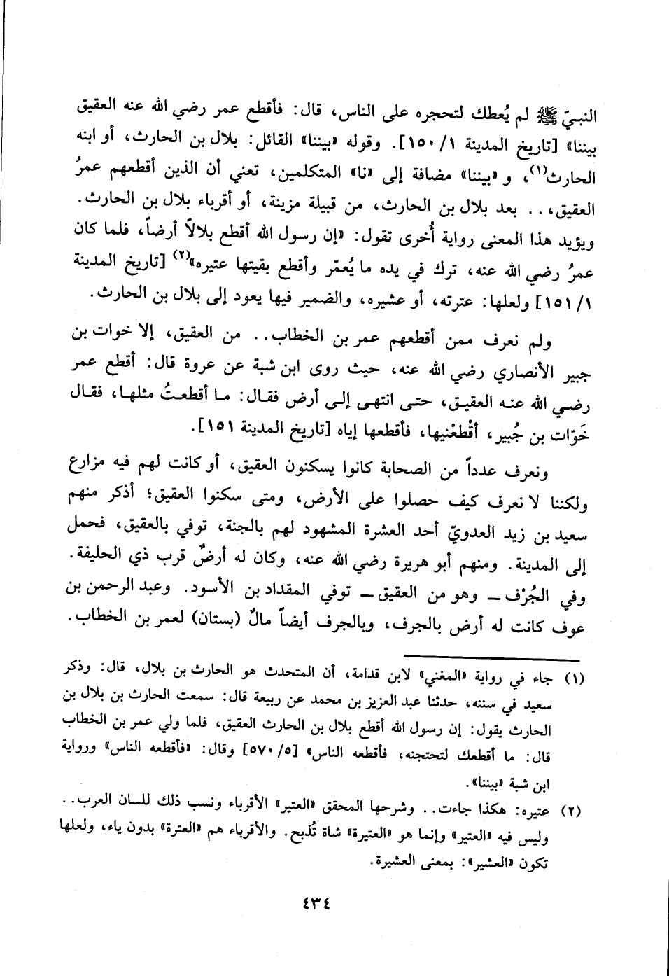 (1) جاء في رواية ((المغني)) لابن قدامة، ان المتحدث هو الحارث بن بن بلال قال: وذكر سعيد في سننه، حدثنا عبد العزيز بن محمد عن ربيعة قال: سمعت الحارث بن بلال بن الحارث يقول: ان رسول الله اقطع بلال بن الحارث العقيق، فلما ولي عمر بن الخطاب قال: ما اقطعك لتحتجنه، فأقطعه الناس)) [5/ 570] وقال: ((فأقطعه الناس)) ورواية ابن شبة ((بيننا)).