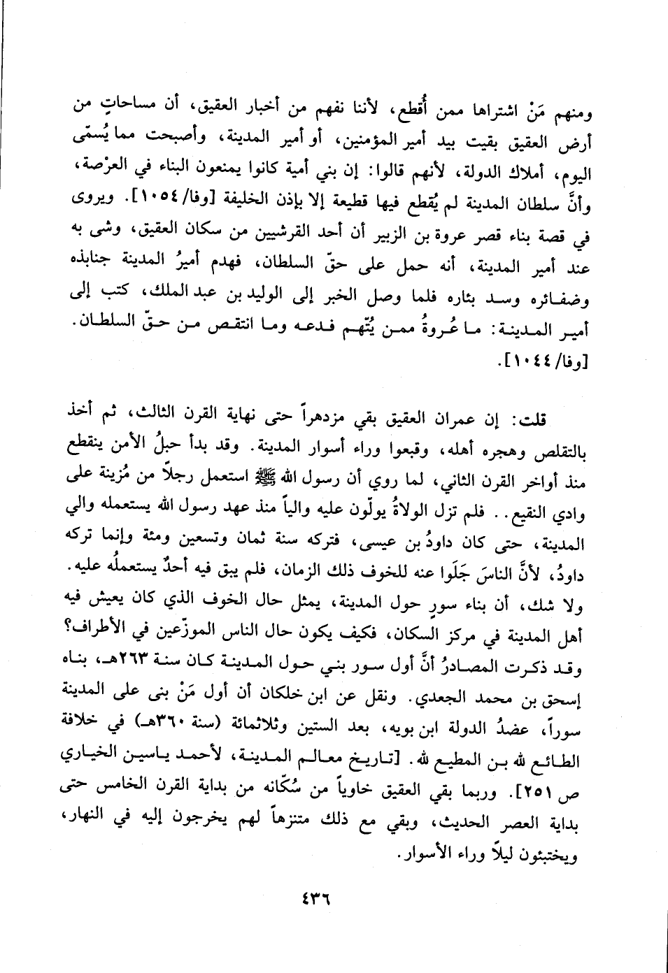 قلت: إن عمران العقيق بقي مزدهرا حتى نهاية القرن الثالث، ثم أخذ بالتقلص وهجره أهله، وقبعوا وراء أسوار المدينة.