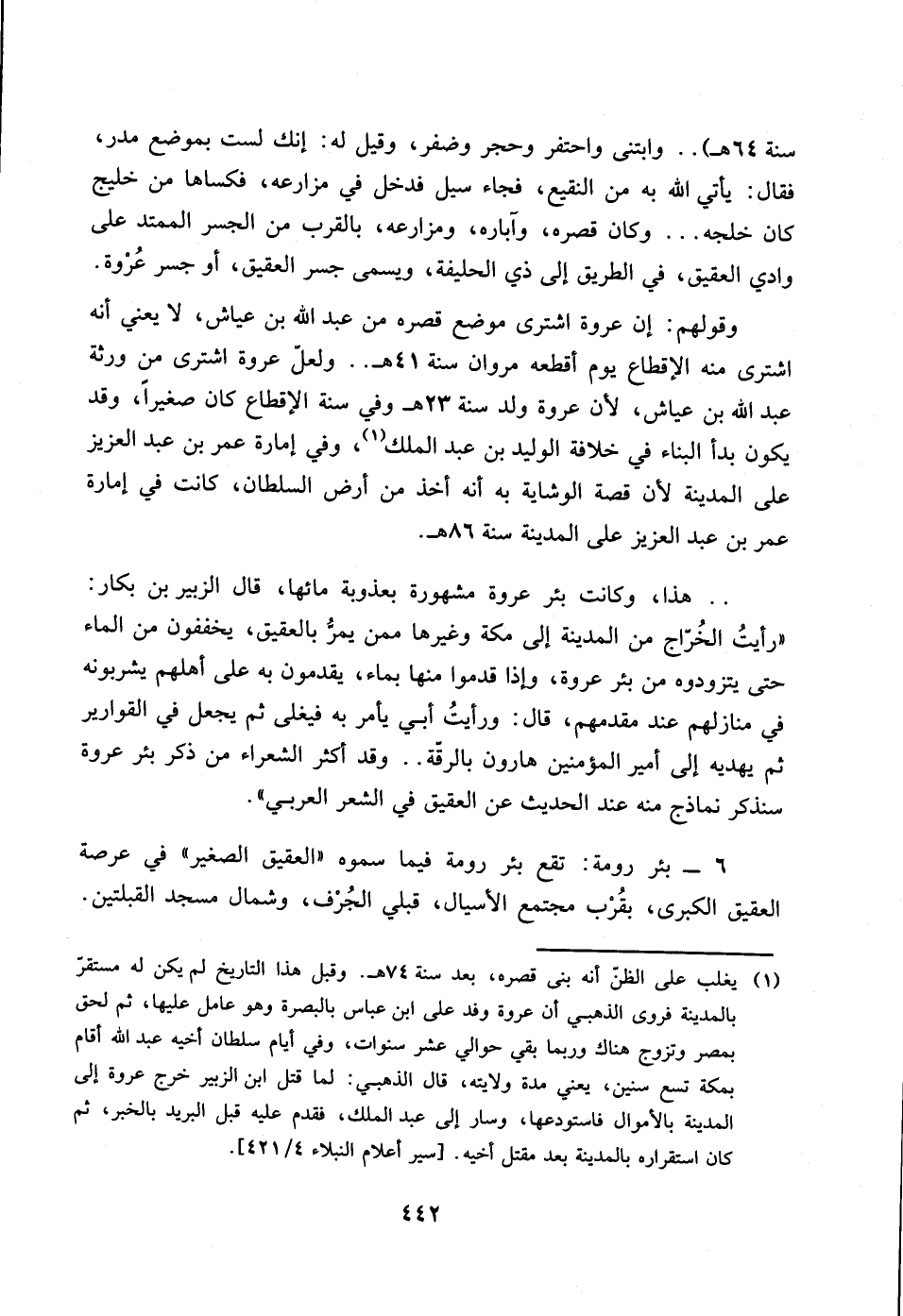 سنة 64) .. وابنتى واحتفر وحجر وضفر , وقيل له: إنك لست بموضع مدر , فقال: يأتي الله به من النقيع , فجاء سيل فدخل في مزارعه , فكساها من خليج كان خلجه ... وكان قصره , وآباره , ومزارعه , بالقرب من الجسر الممتد على وادي العقيق , في الطريق إلى ذي الحليفة , ويسمى جسر العقيق , أو جسر عروة.