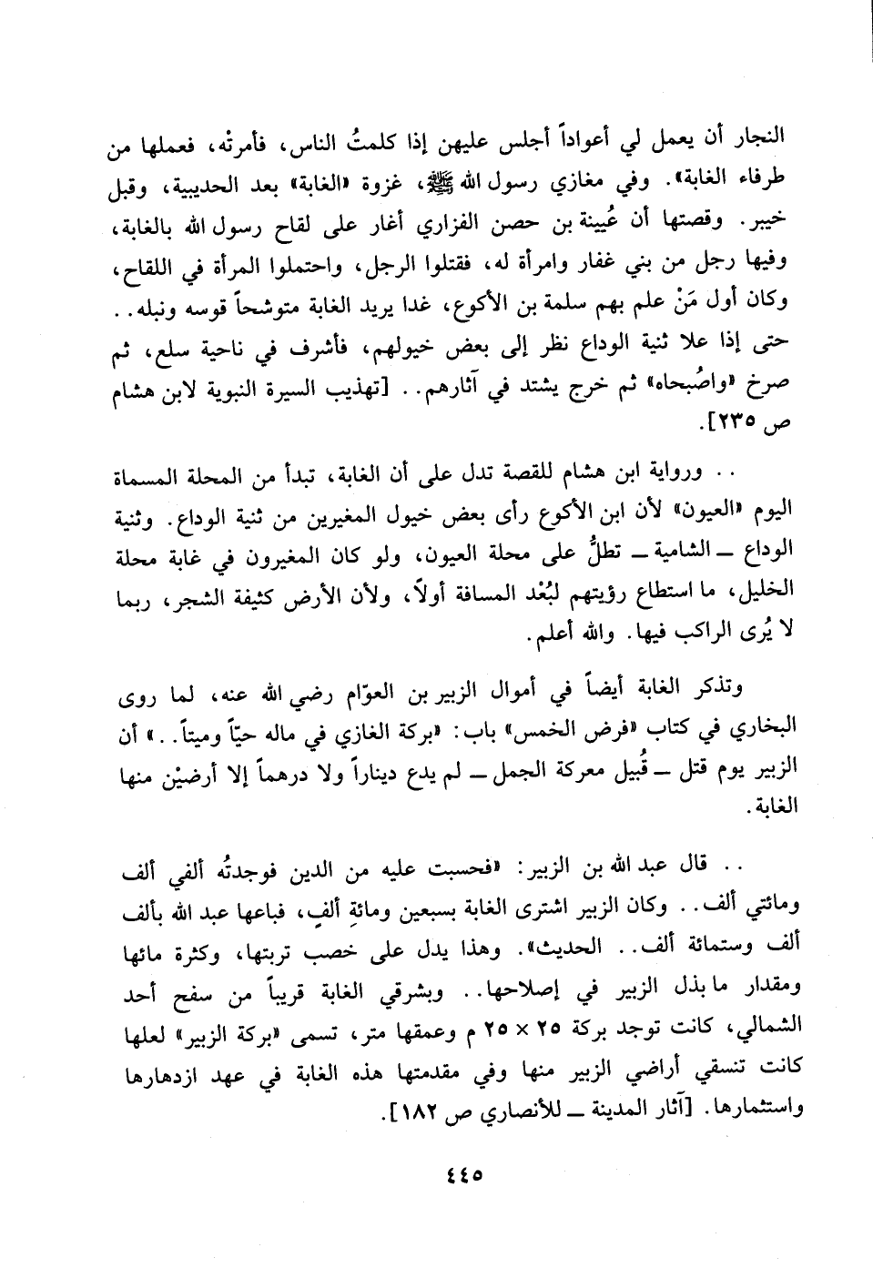 النجار أن يعمل لي أعوادا لي أجلس عليهن إذا كلمت الناس، فامرته، فعملها من طرفاء الغابة)). وفي مغازي رسول الله صلى الله عليه وسلم، غزوة ((الغابة)) بعد الحديبية، وقبل خبير. وقصتها أن عيينة بن حصن الفزاري أغار على لقاح رسول الله بالغابة، وفيها رجل من بني غفار وامرأة له، فقتلوا الرجل، واحتملوا المرأة في اللقاح، وكان أول من علم بهم سلمة بن الأكوع، غدا يريد الغابة متوشحا قوسه ونبله .. حتى إذا علا ثنية الوداع نظر إلى بعض خيولهم، فأشرف في ناحية سلع، ثم صرخ ((واصبحاه)) ثم خرج يشتد في آثارهم .. [تهذيب السيرة النبوية لابن هشام ص 235] ...