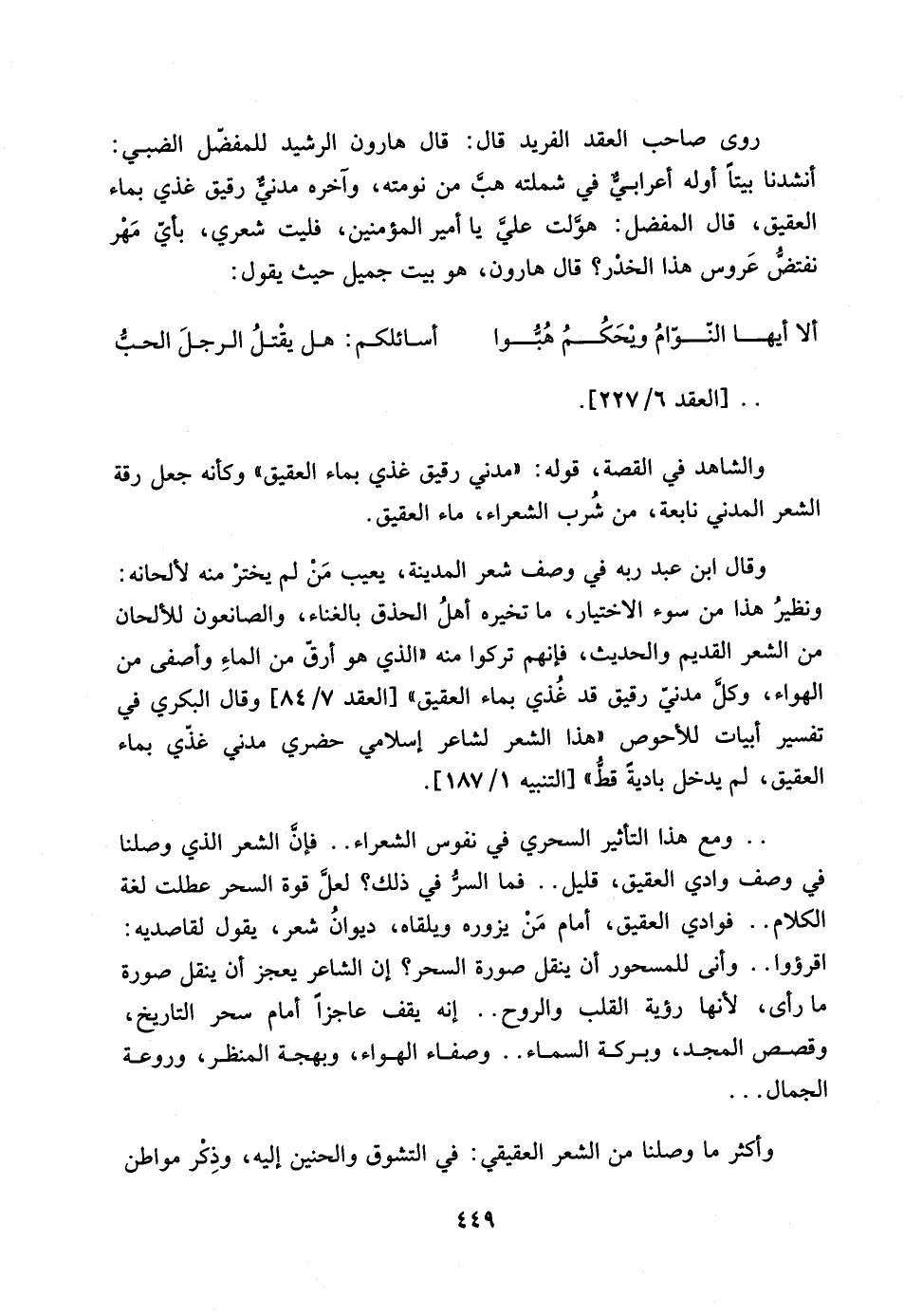 وقال ابن عبد ربه في وصف شعر المدينة، يعيب من لم يختر منه لألحانه: ونظير هذا من سوء الاختيار، ما تخيره أهل الحذق بالغناء، والصانعون للألحان من الشعر القديم و الحديث، فانهم تركوا منه ((الذي هو أرق من الماء وأصفى من الهواء، وكل مدني رقيق قد غذي بماء العقيق)) [العقد 7/ 84] وقال البكري في تفسير أبيات للأحوص ((هذا الشعر لشاعر اسلامي حضري مدني غذي بماء العقيق، لم يدخل بادية قط)) [التنبيه 1/ 187] ...