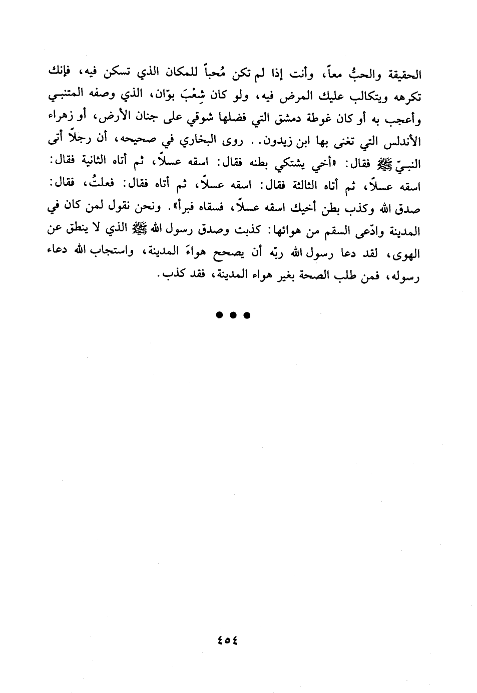 الحقيقة والحب معاً، وانت اذا لم تكن محباً للمكان الذي تسكن فيه، فانك تكرهه ويتكالب عليك المرض فيه، ولو كان شعب بوان، الذي وصفه المتنبي واعجب به او كان غوطة دمشق التي فضلها شوقي على جنان الارض، او زهراء الاندلس التي تغنى بها ابن زيدون .. روى البخاري في صحيحه، ان رجلاً اتى النبي صلى الله عليه وسلم فقال: ((اخي يشتكي بطنه فقال: اسقه عسلاً، ثم اتاه الثانية فقال: اسقه عسلاً، ثم اتاه الثالثة فقال: اسقه عسلاً، ثم اتاه فقال: فقلت، فقال: صدق الله وكذب بطن اخيك اسقه عسلاً، فسقاه فبرأ)).