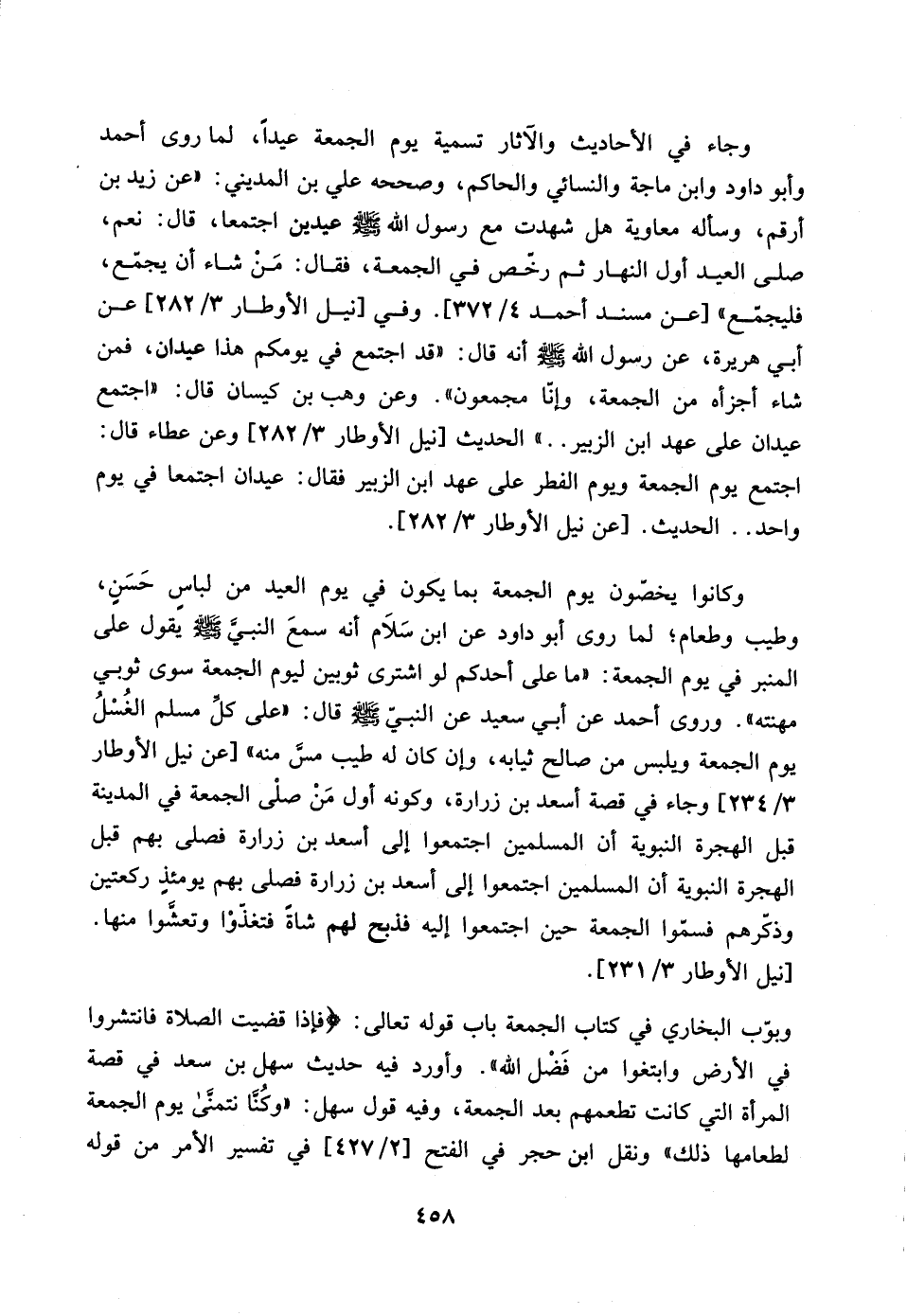 وجاء في الأحاديث والآثار تسمية يوم الجمعة عيداً، لما روى أحمد وأبو داود وابن ماجة والنسائي والحاكم، وصححه علي بن المديني: ((عن زيد بن أرقم، وسأله معاوية هل شهدت مع رسول الله صلى الله عليه وسلم عيدين اجتمعا، قال: نعم، صلى العيد أول النهار ثم رخص في الجمعة، فقال: من شاء أن يجمع، فليجمع)) [عن مسند أحمد 4/ 372].