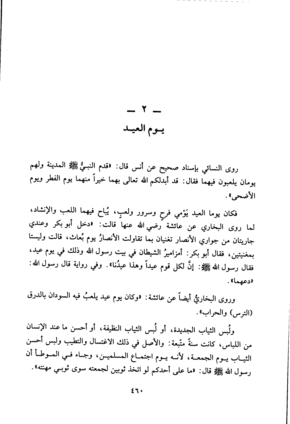 روى النسائي بإسناد صحيح عن أنس قال: ((قدم النبي صلى الله عليه وسلم المدينة ولهم يومان يلعبون فيهما فقال: قد أبدلكم الله تعالى بهما خيرا منهما يوم الفطر ويوم الأضحى)).