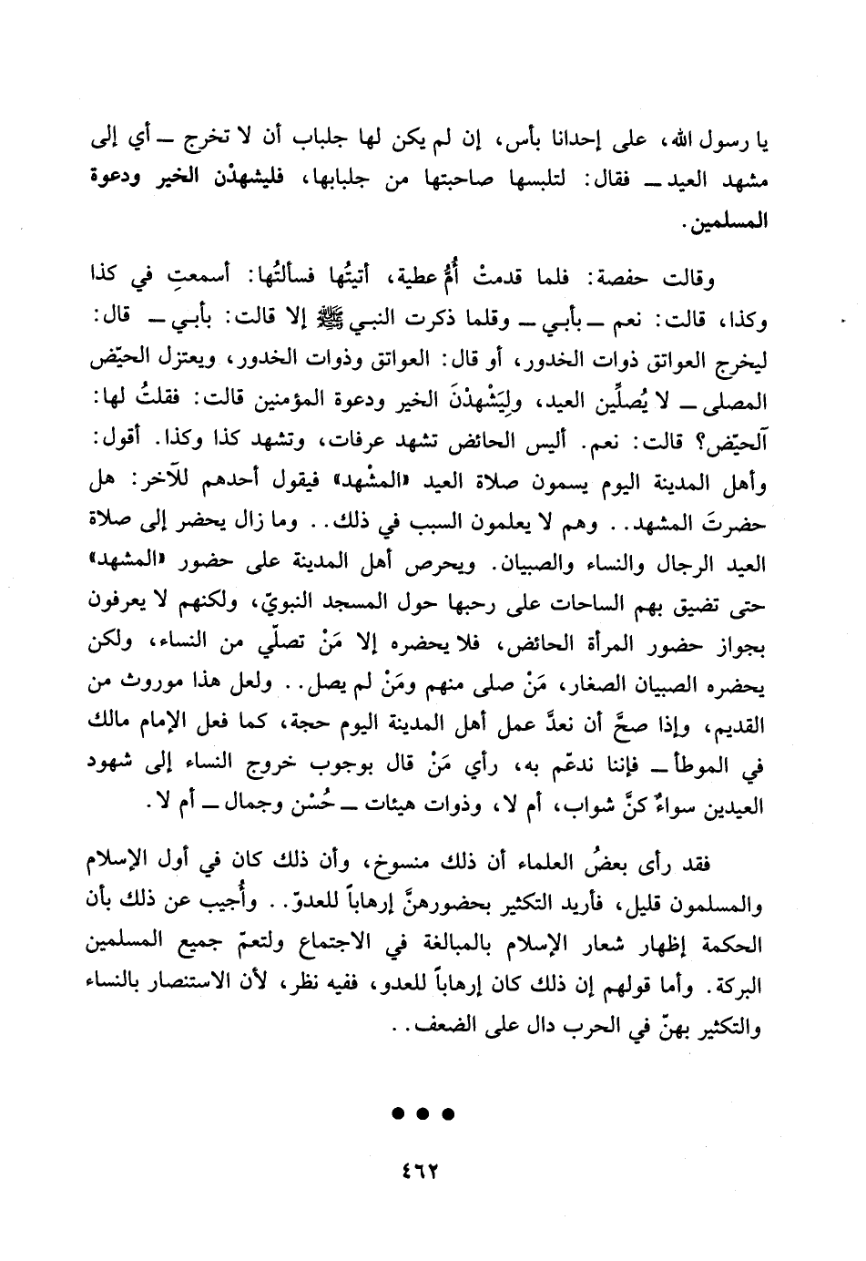 يارسول الله، على إحدنا بأس، إن لم يكن لها جلباب أن لا تخرج ـ أي إلى مشهد العيد ـ فقال: لتلبسها صاحبتها من جلبابها، فليشهدن الخير ودعوة المسلمين.
