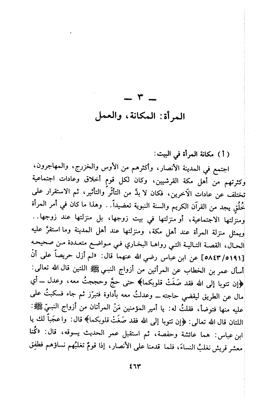 اجتمع في المدينة الأنصار، وأكثرهم من الأوس والخزرج، والمهاجرون، وكثرتهم من أهل مكة القرشيين، وكان لكل قوم أخلاق وعادات اجتماعية تختلف عن عادات الآخرين، فكان لابد من التأثر والتأثير، ثم الاستقرار على خلق يجد من القرآن والسنة النبوية تعضيدا .. وهذا ما كان في أمر المرأة ومنزلتها الاجتماعية، أو منزلتها في بيت زوجها، بل منزلتها عند زوجها .. ويمثل منزلة المرأة عند أهل مكة، ومنزلتها عند أهل المدينة وما أستقر عليه الحال، القصة التالية التي رواها البخاري في مواضع متعددة من صحيحه [5191/ 5843] عن أبن عباس رضي الله عنهما قال: ((لم أزل حريصا على أن أسأل عمر بن الخطاب عن المرأتين من أزواج النبي صلى الله عليه وسلم اللتين قال الله تعالى: (إن تتوبا إلى الله فقد صغت قلوبكما) حتى حج وحججت معه، وعدل ـ أي مال عن الطريق ليقضي حاجته ـ وعدلت معه بأداوة فتبرز ثم جاء فسكبت على عليه منها فتوضأ، فقلت له: يا أمير المؤمنين من المرأتان من أزواج النبي صلى الله عليه وسلم: اللتان قال الله تعالى: (إن تتوبا إلى الله فقد صغت قلوبكما) قال: واعجباً لك يا ابن عباس: هما عائشة وحفصة، ثم استقبل عمر الحديث يسوقه، قال: ((كنا معشر قريش نغلب النساء، فلما قدمنا على الانصار، إذا قوم تغلبهم نساؤهم فطفق…