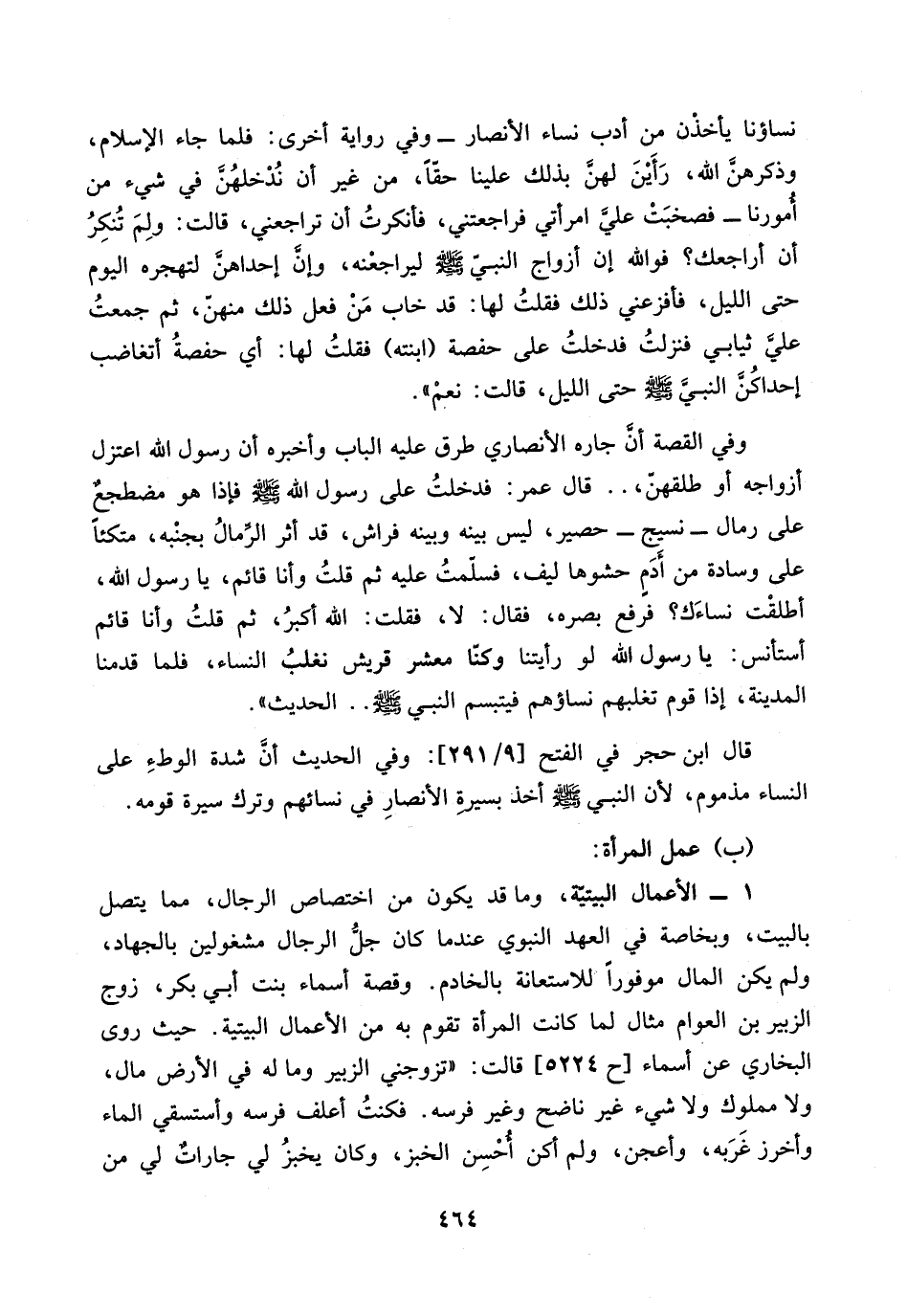 حيث روى البخاري عن أسماء [ح 5224] قالت: تزوجني الزبير وما له في الأرض مال، ولا مملوك ولا شيء غير ناضح وغير فرسه. فكنت أعلف فرسه وأستسقي الماء وأخرز غربه، وأعجن، ولم أكن أحسن الخبز، وكان يخبز جارات لي من…
