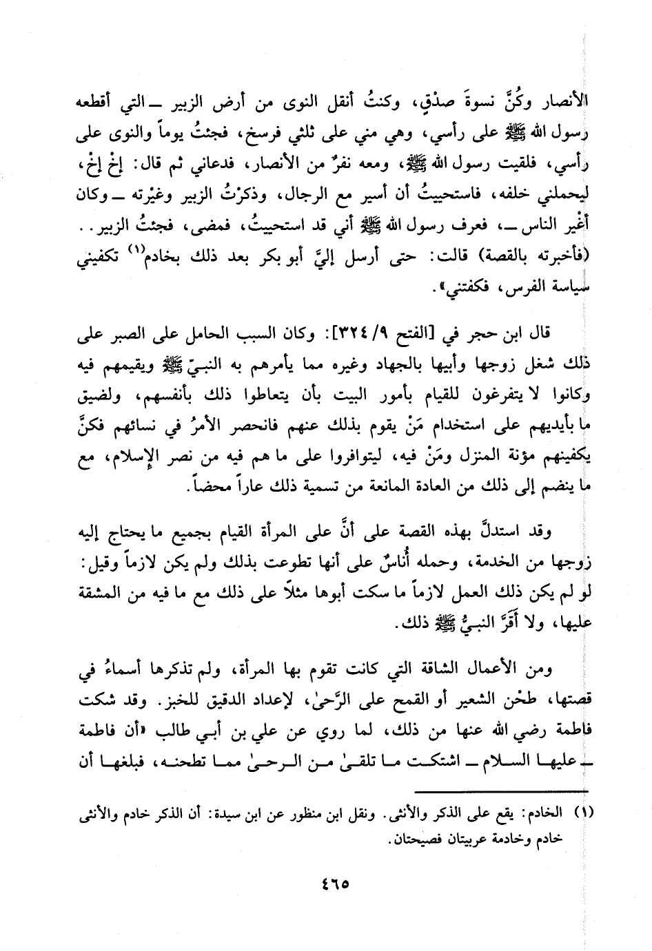 قال ابن حجر [الفتح 9/ 324]: وكان السبب الحامل على الصبر على ذلك شغل زوجها وابيها بالجهاد وغيره مما يأمرهم به النبي صلى الله عليه وسلم ويقيمهم فيه وكانوا لا يتفرغون للقيام بأمور البيت بأن يتعاطوا ذلك بأنفسهم، ولضيق ما بأيديهم على استخدام من يقوم بذلك عنهم فانحصر الأمر في نسائهم فكن يكفينهم مؤنة المنزل ومن فيه، ليتوافروا على ماهم فيه من نصر الإسلام، مع ما ينضم الى ذلك من العادة المانعة من تسمية ذلك عاراً محضاً.