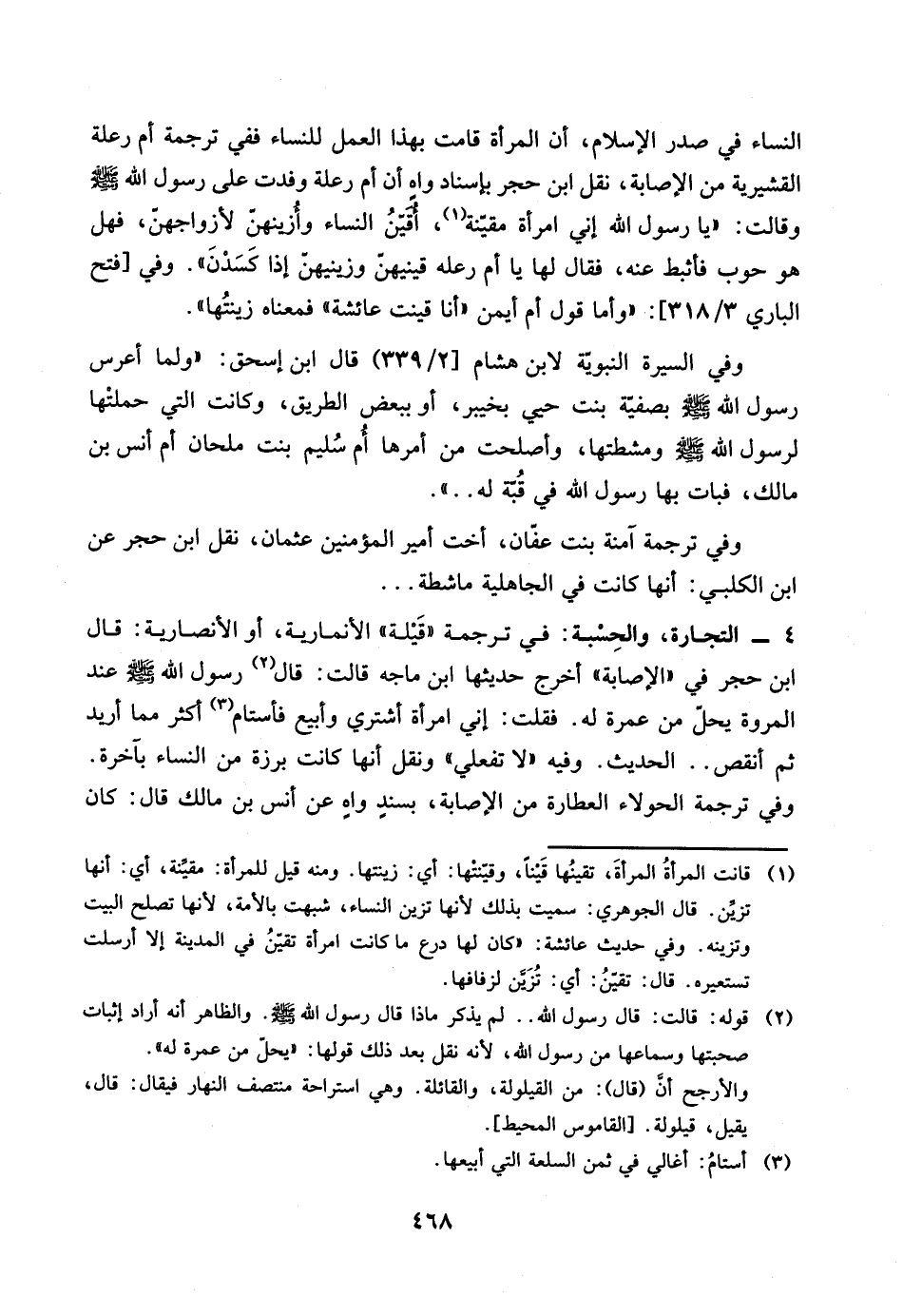 4 ـ التجارة، والحسبة: في ترجمة ((قيلة)) الأنمارية، أو الأنصارية: قال ابن حجر في ((الاصابة)) أخرج حديثا ابن ماجة قالت: قال (2) رسول الله صلى الله عليه وسلم عند المروة يحل من عمرة له.