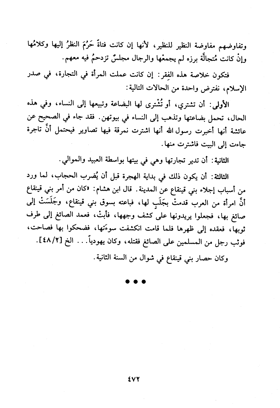 فتكون خلاصة هذه الفقر: ان كانت عملت المرأة في التجارة، في صدر الإسلام، نفترض واحدة من الحلات التالية: الأولى: ان تشتري، او تشترى لها البضاعة وتبيعها الى النساء، وفي هذه الحال، تحمل بضاعتها وتذهب الى النساء في بيوتهن.