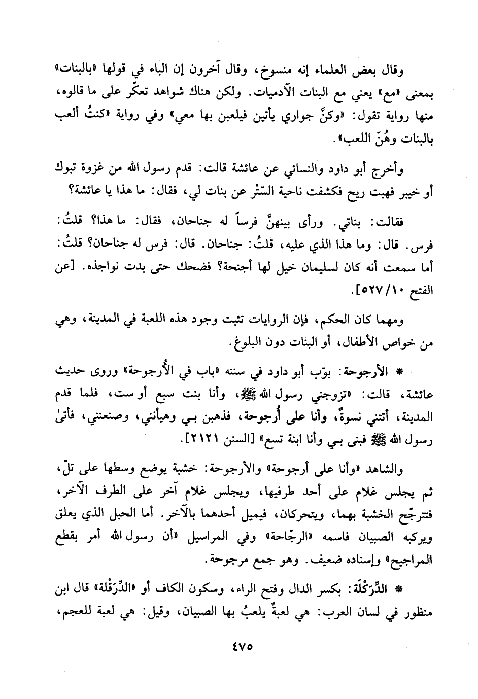 * الارجوحة: بوب ابو داود في سننه ((باب في الارجوحة)) وروى حديث عائشة، قالت: ((تزوجني رسول الله صلى الله عليه وسلم، وانا بنت سبع او ست، فلما قدم المدينة، اتتني نسوة، وانا على ارجوحة، فذهبن بي وهيأنني، وصنعنني، فأتى رسول الله صلى الله عليه وسلم فبنى بي وانا ابنة تسع)) [السنن 2121].