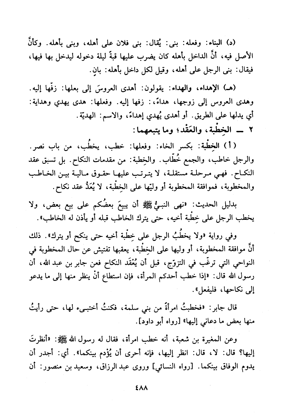 (أ) الخطبة: بكسر الخاء: وفعلها: خطب، يخطب، من باب نصر. والرجل خاطب، والجمع خطاب. والخطبة: من مقدمات النكاح. بل تسبق عقد النكاح. فهي مرحلة مستقلة، لا يترتب عليها حقوق مالية بين الخاطب والمخطوية، فموافقة المخطوبة أو وليها على الخطبة، لا يعد عقد نكاح.