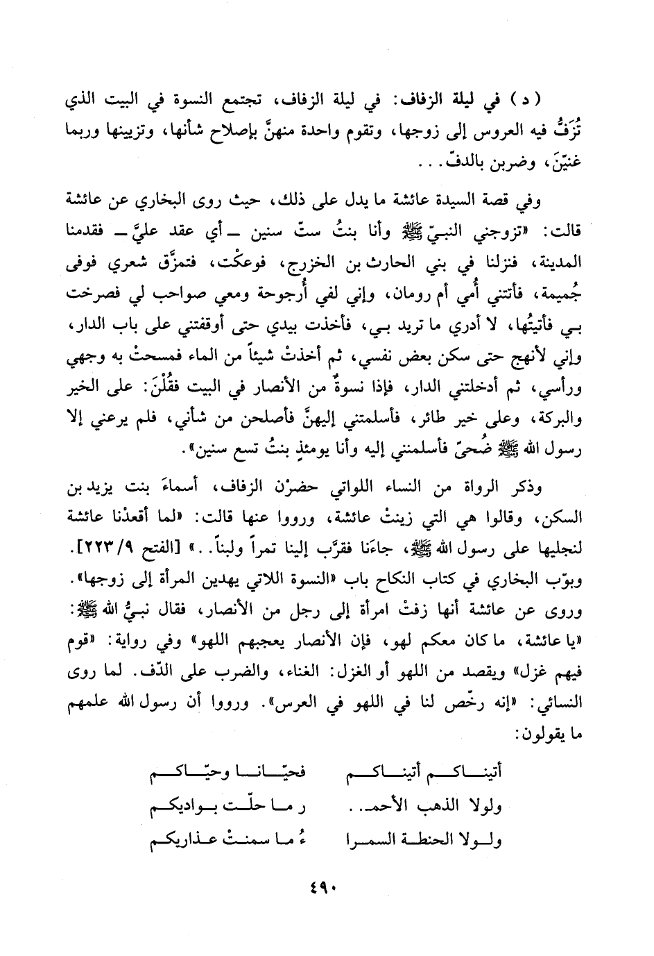 وبوب البخاري في كتاب النكاح باب ((النسوة اللاتي يهدين المرأة إلى زوجها))، وروى عن عائشة أنها زفت امرأة إلى رجل من الأنصار، فقال نبي الله صلى الله عليه وسلم: ((ياعائشة، ما كان معكم لهو، فإن الأنصار يعجبهم اللهو)) وفي رواية: ((قوم فيهم غزل)) ويقصد من اللهو أو الغزل: الغناء، والضرب على الدف. لما روى النسائي: ((إنه رخص لنا في اللهو في العرس)).