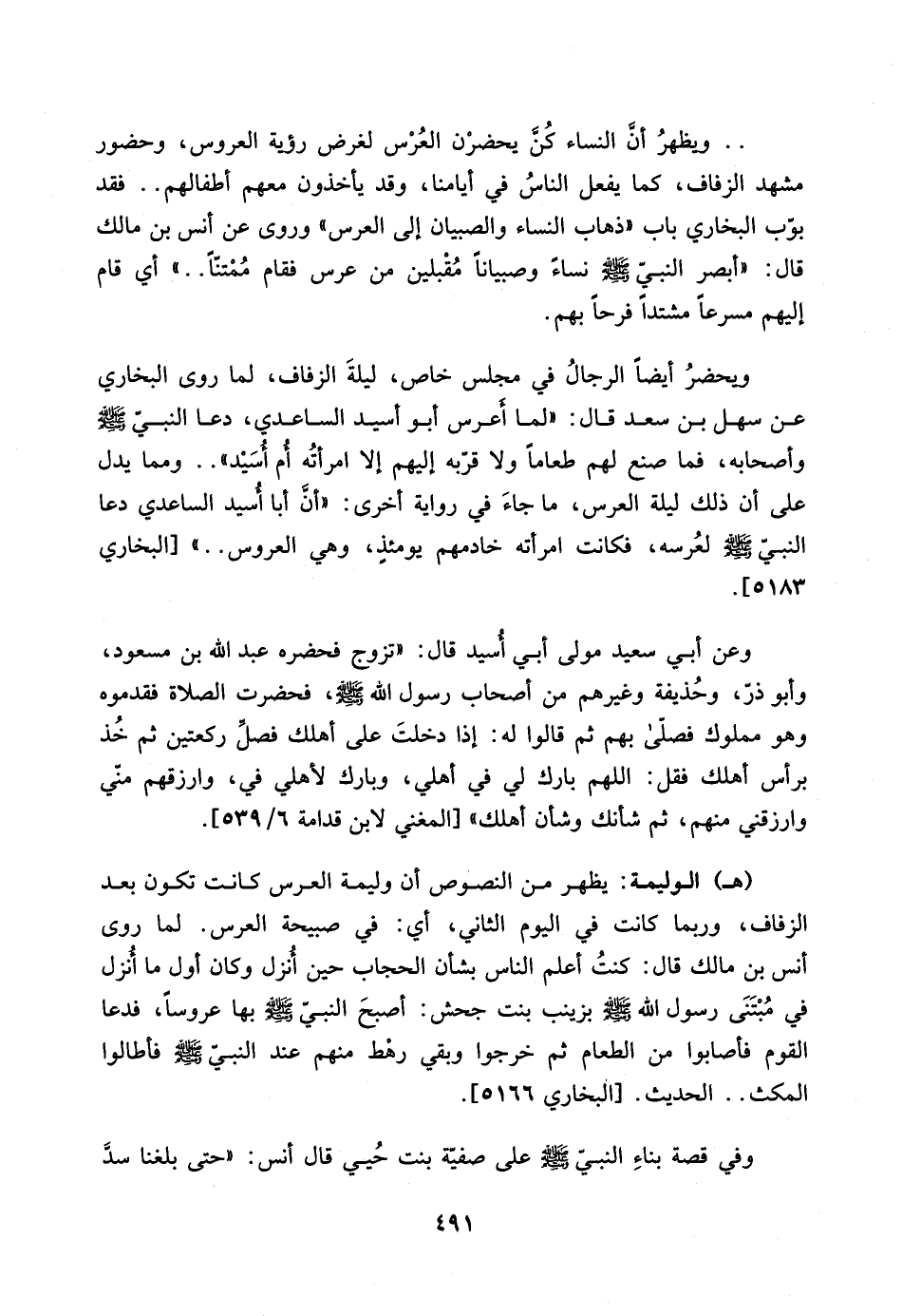 .. ويظهر أن النساء كن يحضرن العرس لغرض رؤية العروس، وحضور مشهد الزفاف، كما يفعل الناس في أيامنا، وقد يأخذون معهم أطفالهم .. فقد بوب البخاري باب ((ذهاب النساء والصبيان إلى العرس)) وروى عن أنس بن مالك قال: ((أبصر النبي صلى الله عليه وسلم نساء وصبيانا مقبلين من عرس فقام ممتنا .. )) أي قام إليهم مسرعا مشتدا فرحا بهم.