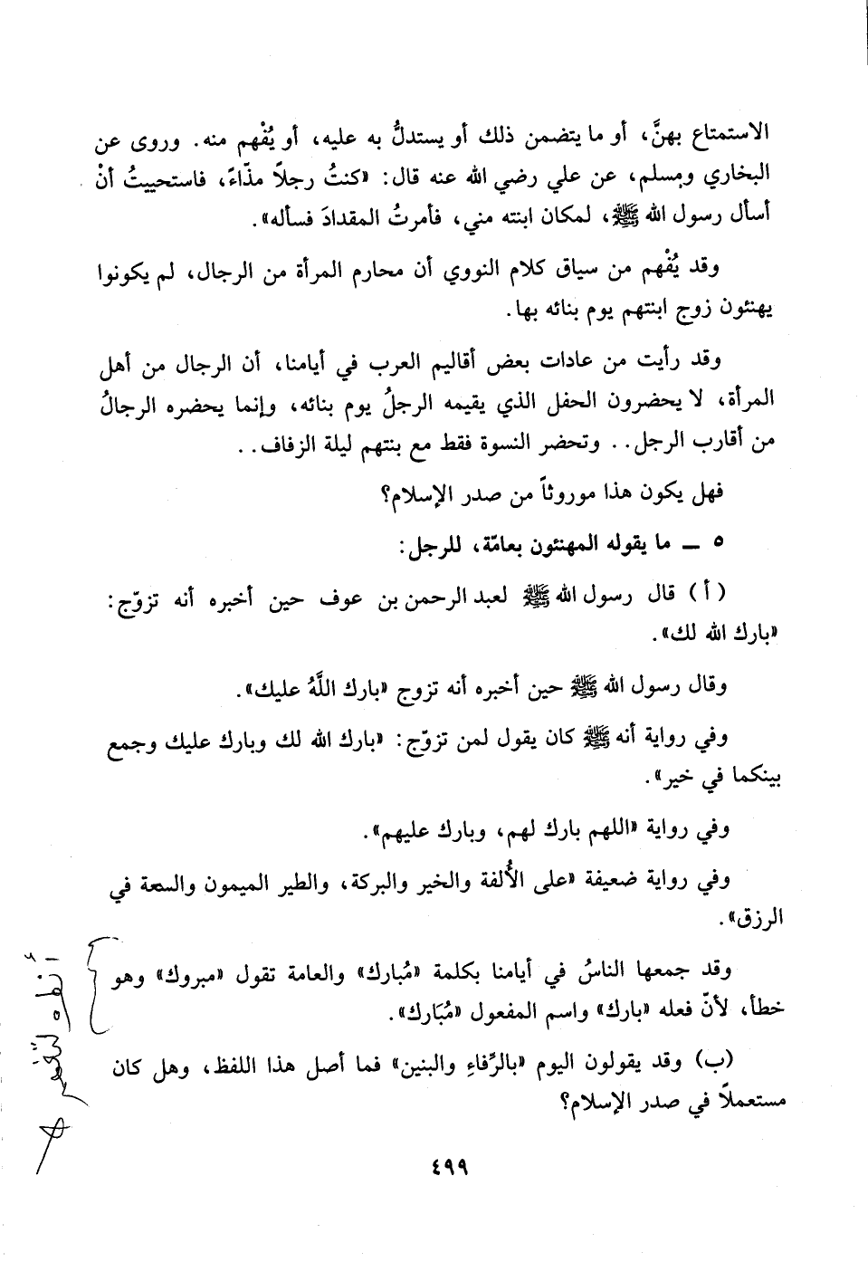 (ب) وقد يقولون اليوم ((بالرفاء والبنين)) فما أصل هذا اللفظ , وهل كان مستعملا في صدر الاسلام؟ …