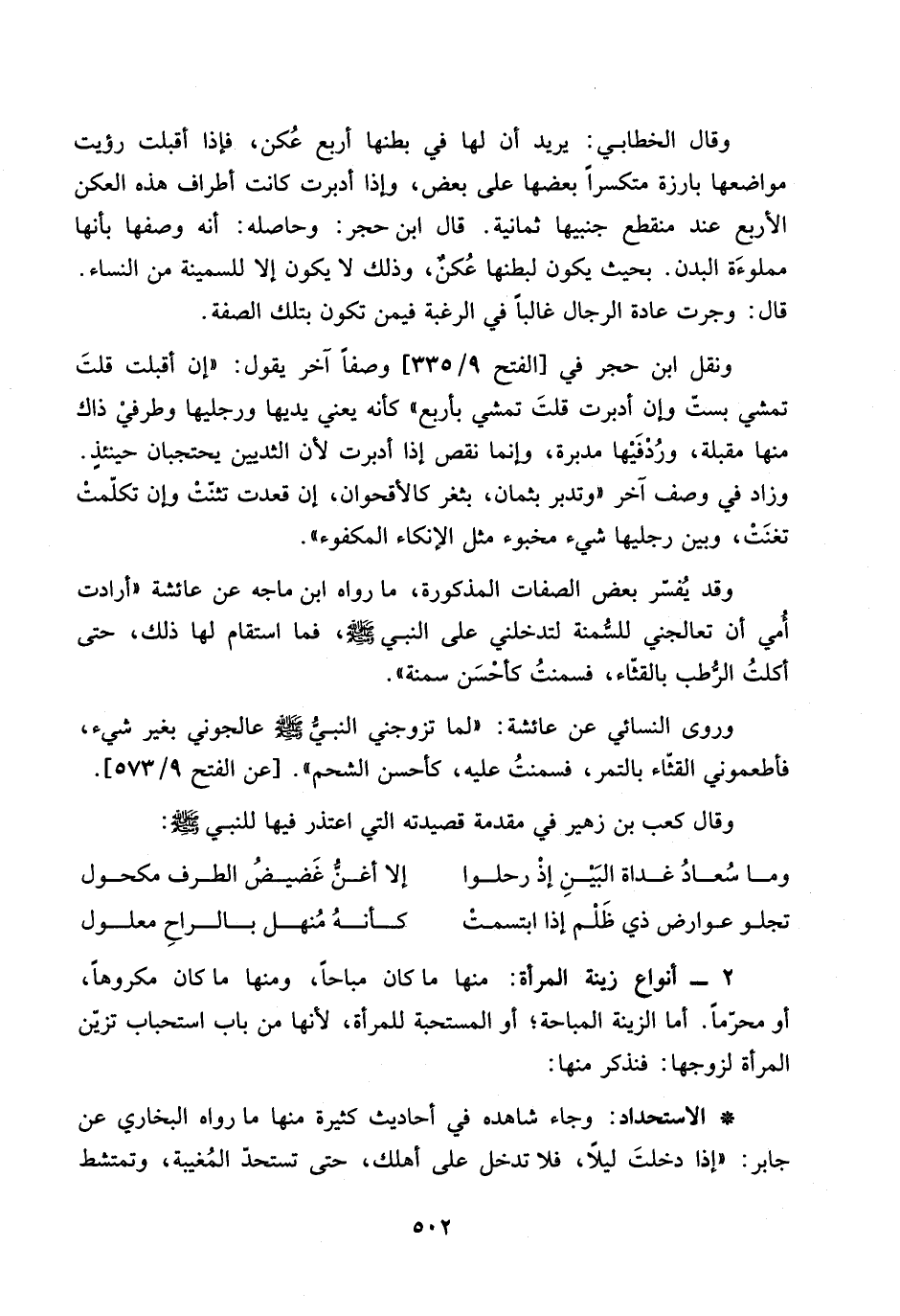 ونقل ابن حجر في [الفتح 9/ 335] وصفا آخر يقول: ((إن أقبلت قلت تمشي بست وإن أدبرت قلت تمشي بأربع)) كأنه يعني يديها ورجليها وطرفي ذاك منها مقبلة , وردفيها مدبرة , وإنما نقص إذا أدبرت لأن الثديين يحتجبان حينئذ.