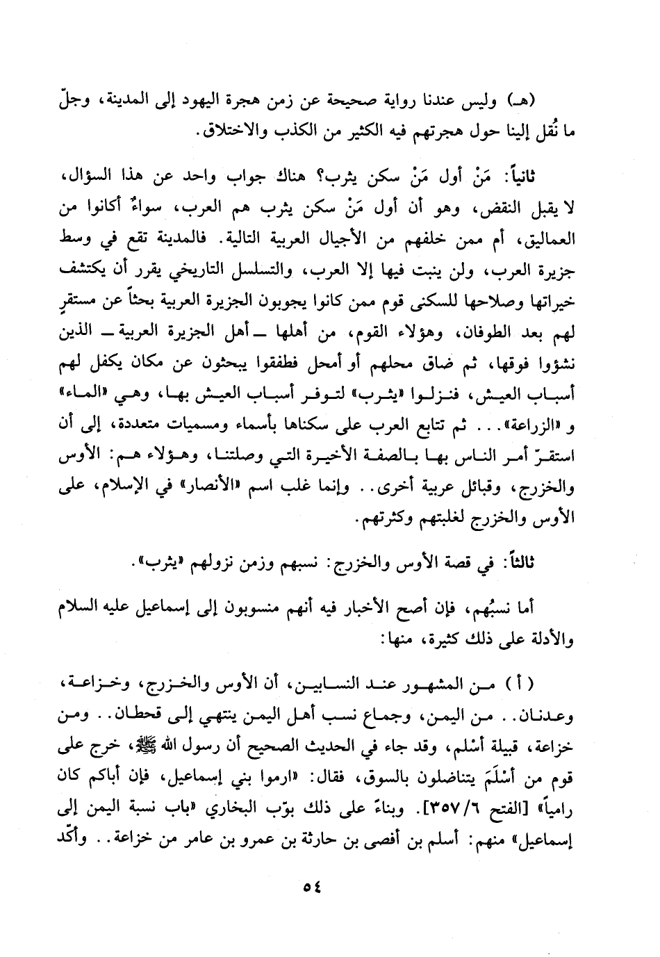 54… (هـ) وليس عندنا رواية صحيحة عن زمن هجرة اليهود إلى المدينة، وجل ما نقل إلينا هجرتهم فيه الكثير من الكذب والاختلاق.
