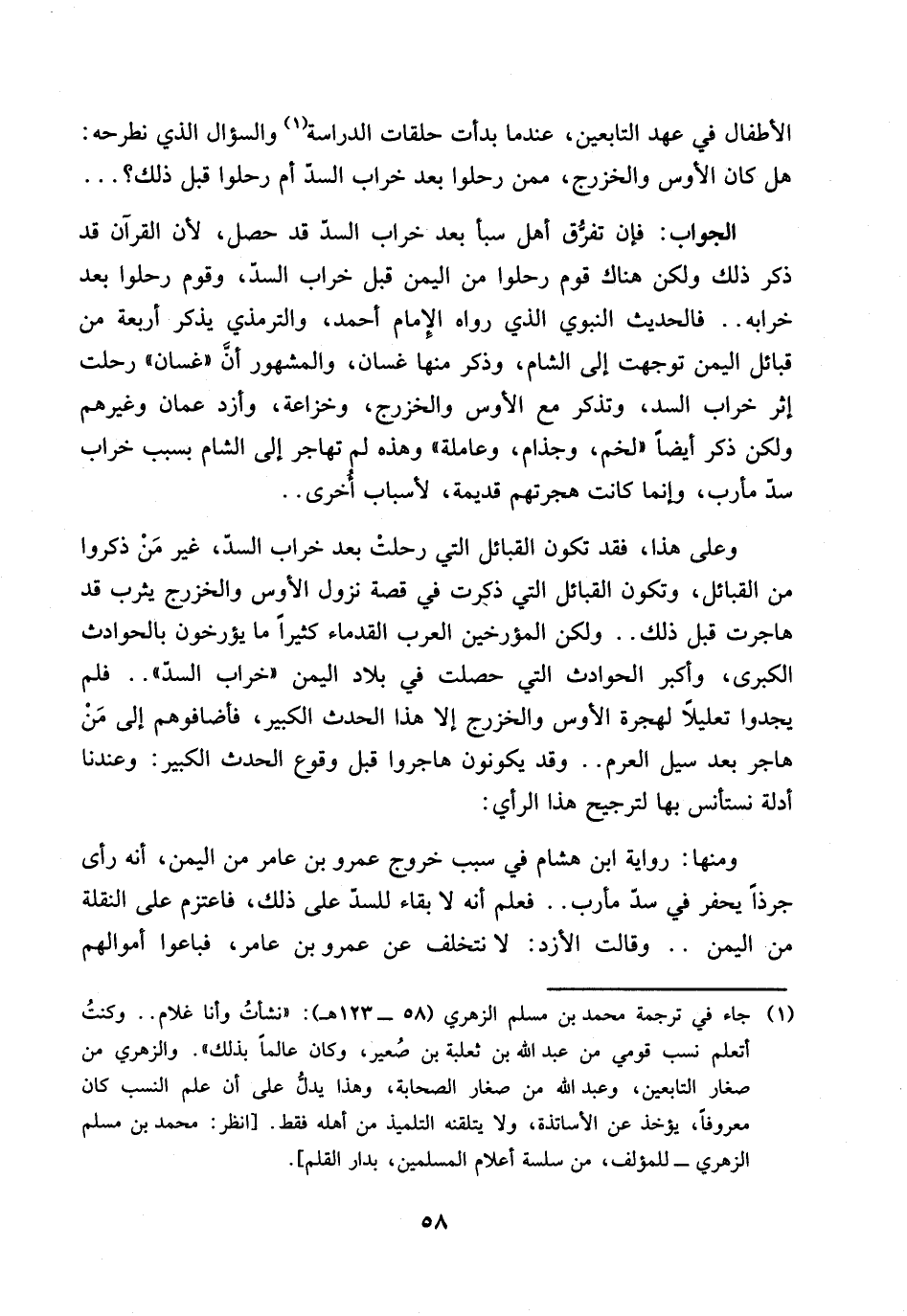 58…الأطفال في عهد التابعين , عندما بدأت حلقات الدراسة (1) والسؤال الذي نطرحه: هل كان الأوس والخزرج , ممن رحلوا بعد خراب السد أم رحلوا قبل ذلك؟