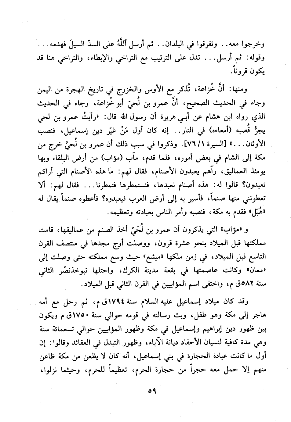 وقد كان ميلاد إسماعيل عليه السلام سنة 1794 ق م , ثم رحل مع أمه هاجر إلى مكة وهو طفل , وبث رسالته في قومه حوالي سنة 1750 ق م ويكون بين ظهور دين إبراهيم وإسماعيل في مكة وظهور المؤابيين حوالي تسعمائة سنة وهي مدة كافية لنسيان الأحفاد ديانة الآباء , وظهور التبدل في العقائد وقالوا: إن أول ما كانت عبادة الحجارة في بني إسماعيل , أنه كان لا يظعن من مكة ظاعن منهم إلا حمل معه حجرا من حجارة الحرم , تعظيما للحرم , وحيثما نزلوا,…