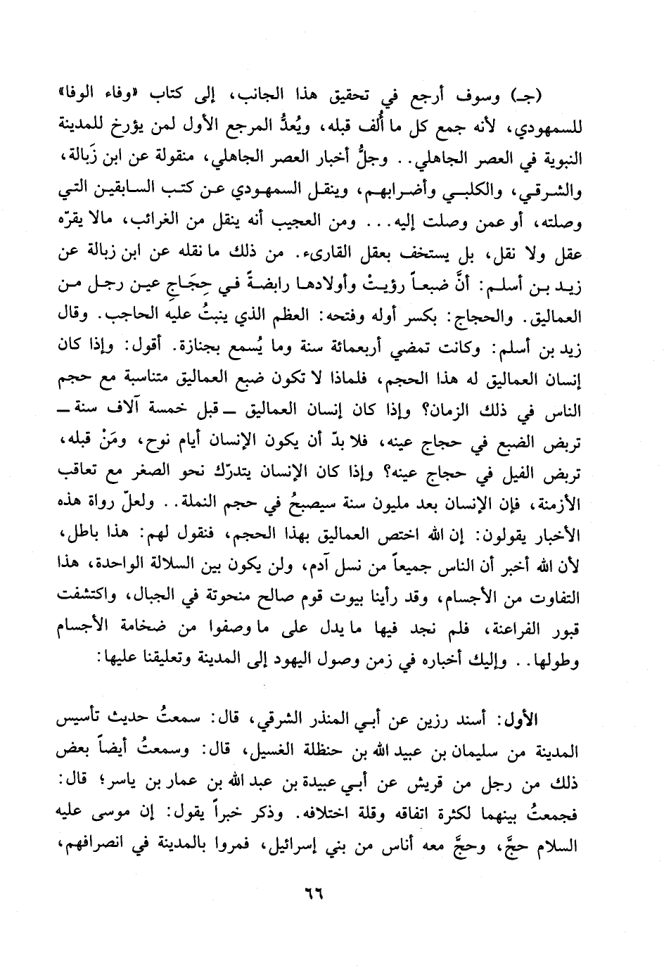 66… (جـ) وسوف أرجع في تحقيق هذا الجانب، غلى كتاب ((وفاء الوفا)) للسمهودي، لأنه جمع كل ماألف قبله، ويعد المرجع الأول لمن يؤرخ للمدينة النبوية في العصر الجاهلي .. وجلُّ أخبارالعصر الجاهلي، منقولة عن ابن زبالة، والشرقي، والكلبي وأضرابهم، وينقل السمهودي عن كتب السابقين التي وصلته، أو عمن وصلت اليه ... ومن العجيب أنه ينقل من الغرائب، ما لا يقره عقل ولا نقل، بل يستخف بعقل القارئ.