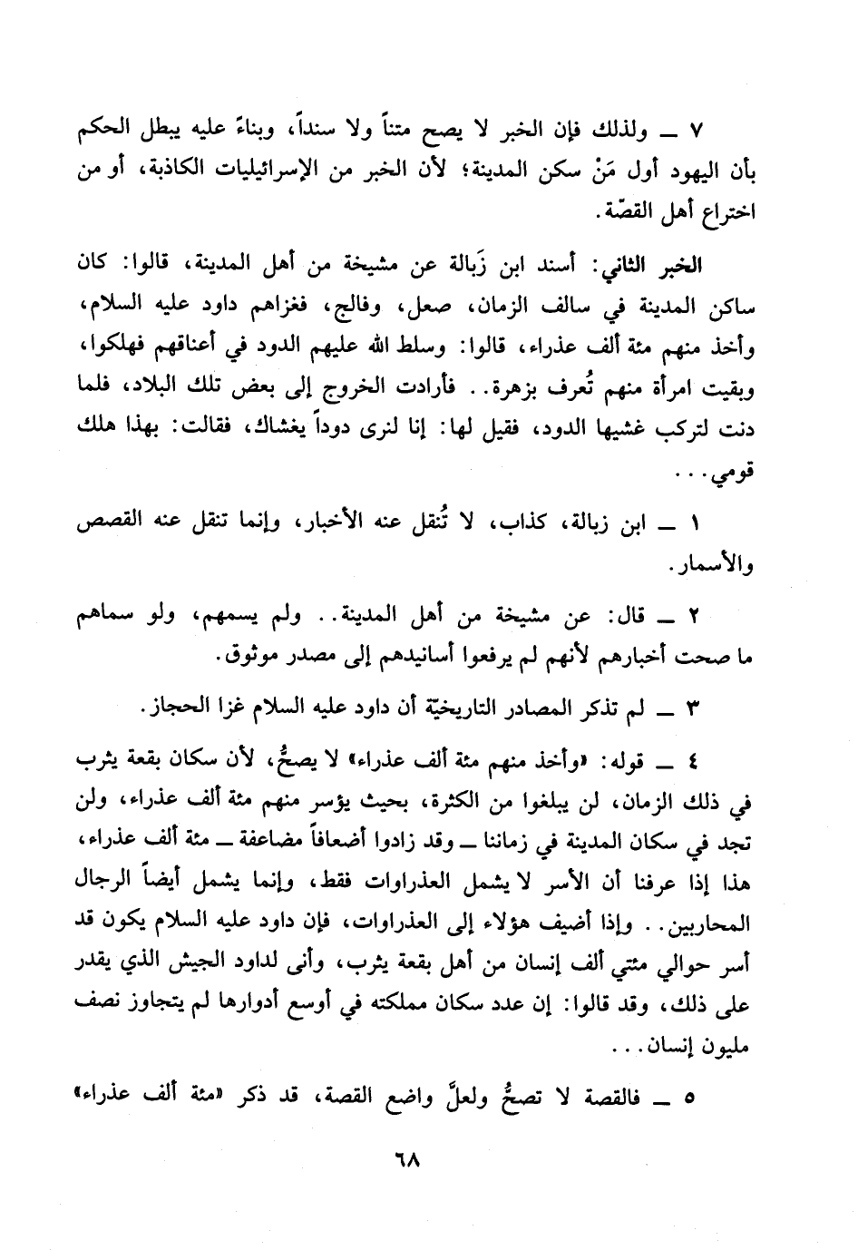 4 - قوله: ((وأخذ منهم مئة ألف عذراء لايصح، لأن سكان بقعة يثرب في ذلك الزمان لن يبلغوا من الكثرة، بحيث يؤسر منهم مئة ألف عذراء، ولن تجد في سكان المدينة في زماننا ـ وقد زادوا أضعافاً مضاعفة ـ مئة ألف عذراء، هذا إذا عرفنا أن الاسر لايشمل العذراوات فقط، وإنما يشمل أيضاً الرجال المحاربين .. وإذا أضيف هؤلاء إلى العذراوات، فإن داود عليه السلام يكون قد أسر حوالي مئتي ألف انسان من أهل بقعة يثرب، وأنى لداود الجيش الذي يقدر على ذلك، وقد قالوا: إن عدد سكان مملكته في أوسع أدوارها لم يتجاوز نصف مليون إنسان ... 5 - فالقصة لا تصح ولعل واضع القصة، قد ذكر ((مئة ألف عذراء)) …