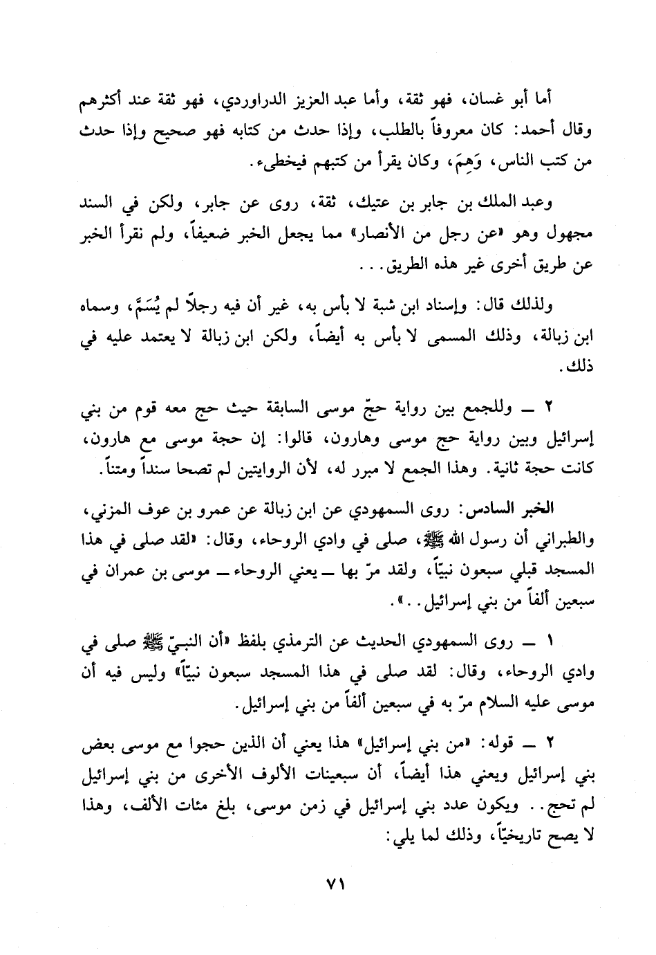 1 - روى السمهودي الحديث عن الترمذي بلفظ ((أن النبي صلى الله عليه وسلم صلى في وادي الروحاء، وقال: لقد صلى في هذا المسجد سبعون نبياً)) وليس فيه أن موسى عليه السلام مر به في سبعين ألفاً من بني إسرائيل.