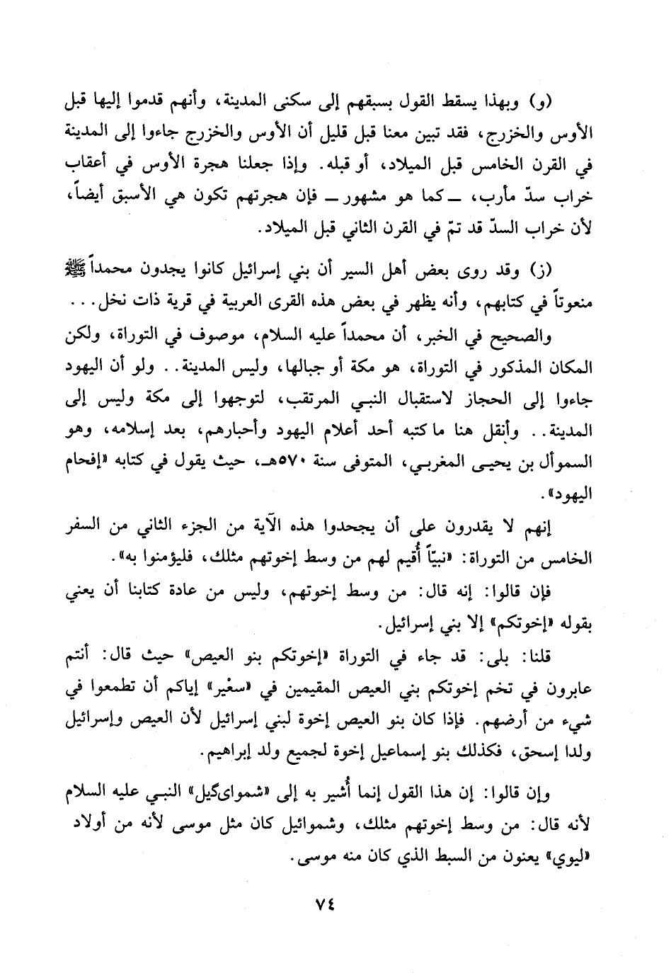 (ز) وقد روى بعض أهل السير أن بني إسرائيل كانوا يجدون محمداً صلى الله عليه وسلم منعوتاً في كتابهم وأنه يظهر في بعض هذه القرى العربية في قرية ذات نخل ... والصحيح في الخبر، أن محمداً عليه السلام، موصوف في التوراة، ولكن المكان المذكور في التوراة، هو مكة أو جبالها، وليس المدينة .. ولو أن اليهود جاءوا إلى الحجاز لاستقبال النبي المرتقب، لتوجهوا إلى مكة وليس إلى المدينة .. وأنقل هنا ما كتبه أحد أعلام اليهود وأحبارهم، بعد إسلامه، وهو السموأل بن يحيى المغربي، المتوفى سنة 570 هـ، حيث يقول في كتابه ((إفحام اليهود)).