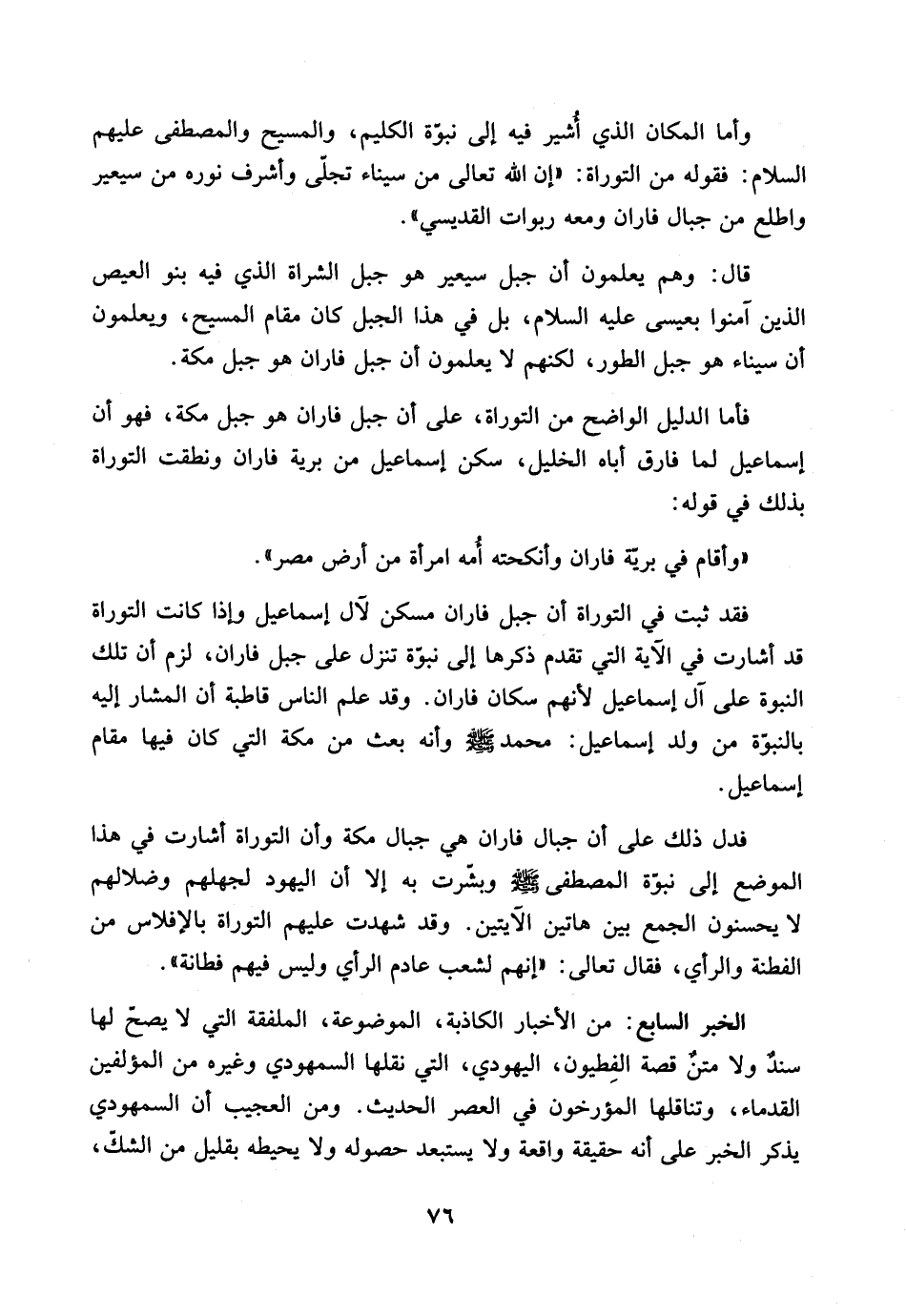 76…وأما المكان الذي اشير فيه إلى نبوة الكليم، والمسيح والمصطفى عليهم السلام: فقوله من التوراة: ((إن الله تعالى من سيناء تجلى وأشرف نوره من سيعير واطلع من جبال فاران ومعه ربوات القديسي)).