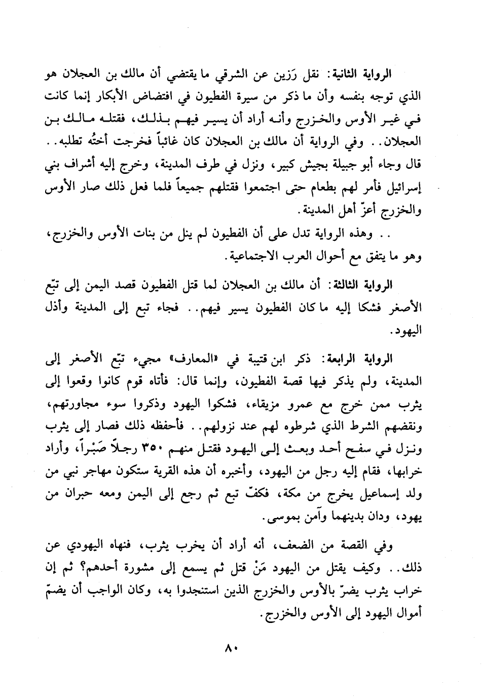 80…الرواية الثانية: نقل رزين عن الشرقي ما يقتضي أن مالك بن العجلان هو الذي توجه بنفسه وأن ماذكر من سيرة الفطيون في افتضاض الأبكار إنما كانت في غير الأوس والخزرج وأنه أراد أن يسير فيهم بذلك، فقتله مالك بن العجلان .. وفي الرواية أن مالك بن العجلان كان غائباً فخرجت اخته تطلبه .. قال وجاء أبو جبيلة بجيش كبير , ونزل في طرف المدينة، وخرج إليه أشراف بني إسرائيل فأمر لهم بطعام حتى اجتمعوا فقتلهم جميعاً فلما فعل ذلك صار الأوس والخزرج أعز أهل المدينة ... وهذه الرواية تدل على أن الفطيون لم ينل من بنات الأوس والخزرج، وهو مايتفق مع أحوال العرب الاجتماعية.