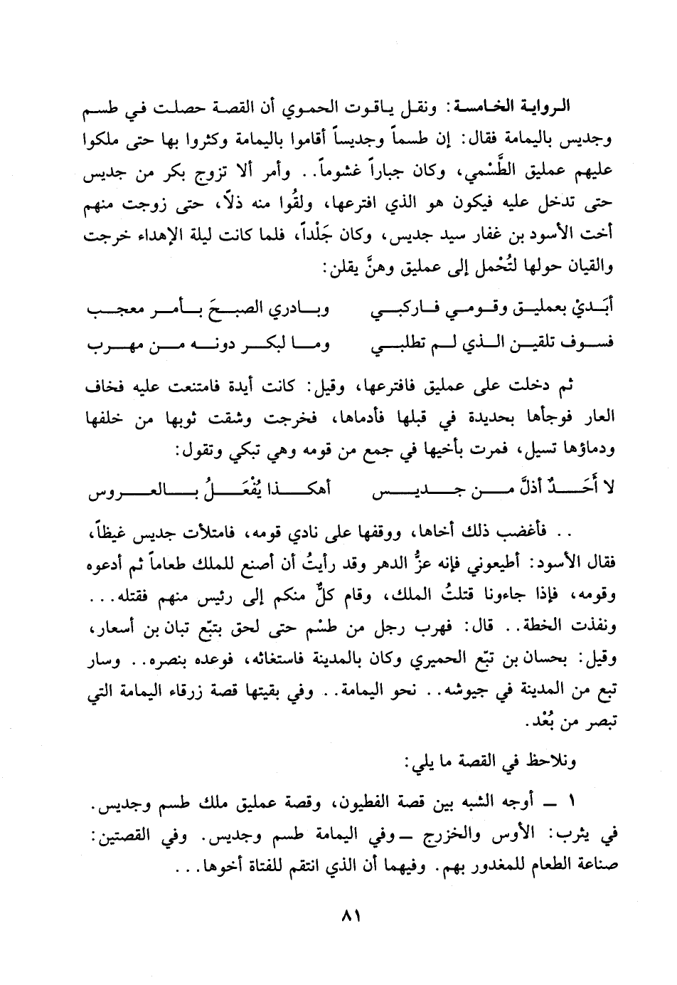 81…الرواية الخامسة: ونقل ياقوت الحموي أن القصة حصلت في طسم وجديس باليمامة فقال: إن طسماً وجديساً أقاموا باليمامة وكثروا بها حتى ملكوا عليهم عمليق الطسمي، وكان جباراً غشوماً .. وأمر ألا تزوج بكر من جديس حتى تدخل عليه فيكون هو الذي افترعها، ولقوا منه ذلاً، حتى زوجت منهم اخت الأسود بن غفار سيد جديس، وكان جلداً، فلما كانت ليلة الإهداء خرجت والقيان حولها لتحمل إلى عمليق وهن يقلن: