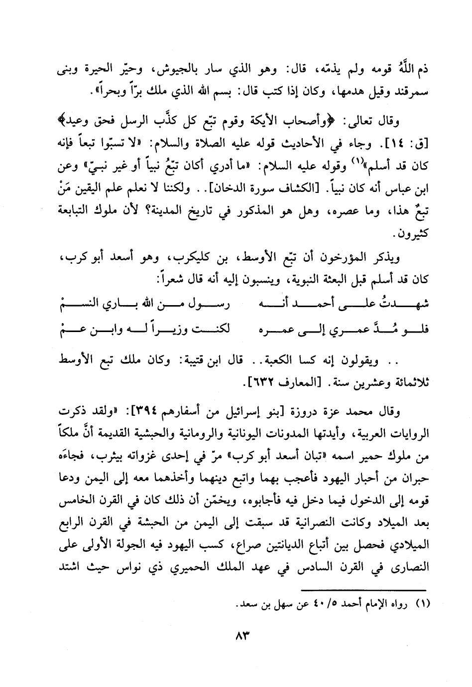 وجاء في الأحاديث قوله عليه الصلاة والسلام: ((لا تسبوا تبعاً فإنه كان قد أسلم)) (1) وقوله عليه السلام: ((ما أدري أكان تبع نبياً أو غير نبي)) وعن ابن عباس أنه كان نبياً. [الكشاف سورة الدخان] .. ولكننا لا نعلم علم اليقين من تبع هذا، وما عصره، وهل هو المذكور في تاريخ المدينة؟ لأن ملوك التبابعة كثيرون.