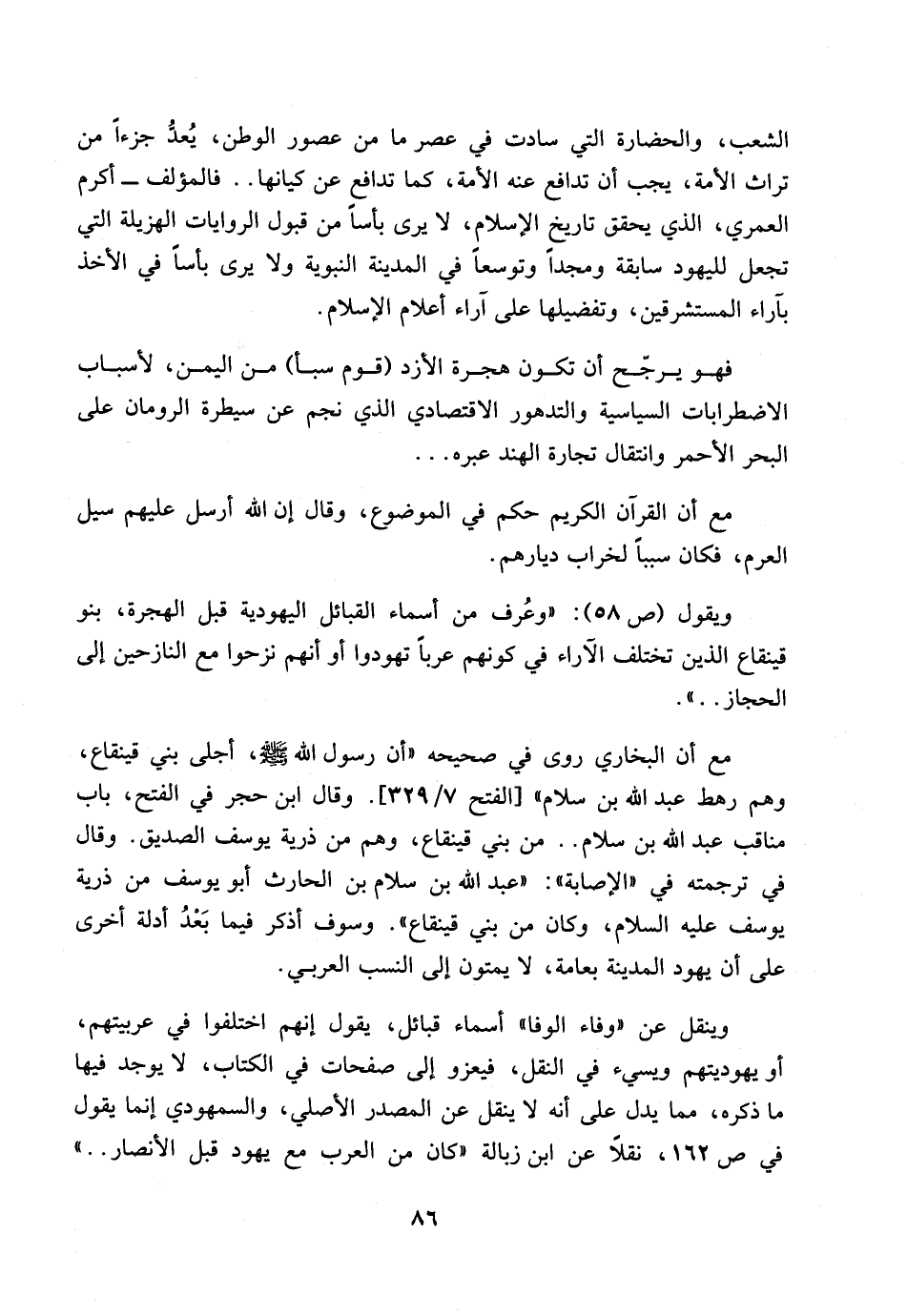86…الشعب، والحضارة التي سادت في عصر ما من عصور الوطن، يعد جزءاً من تراث الأمة، يجب أن تدافع عنه الأمة، كما تدافع عن كيانها .. فالمؤلف ـ أكرم العمري، الذي يحقق تاريخ الإسلام، ولا يرى بأساً من قبول الروايات الهزيلة التي تجعل لليهود سابقة ومجداً وتوسعاً في المدينة النبوية ولا يرى بأساً في الأخذ بآراء المستشرقين، وتفضيلها على آراء أعلام الإسلام.