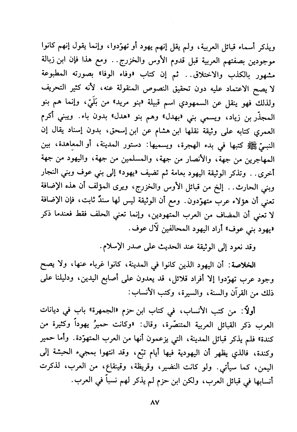87…ويذكر أسماء قبائل العربية، ولم يقل أنـ÷م يهود أو تهودوا، وإنما يقول أنهم كانوا موجودين بصفتهم العربية قبل قدوم الأوس والخزرج .. ومع هذا فإن ابن زبالة مشهور بالكذب والاختلاق .. ثم إن كتاب ((وفاء الوفا)) بصورته المطبوعة لا يصح الاعتماد عليه دون تحقيق النصوص المنقولة عنه، لأنه كثير التحريف ولذلك فهو ينقل عن السمهودي اسم قبيلة ((بنو مريد)) من بلي، وإنما هم بنو المجذر بن زياد، ويسمي بني ((بهدل)) وهم بنو ((هدل)) بدون باء.