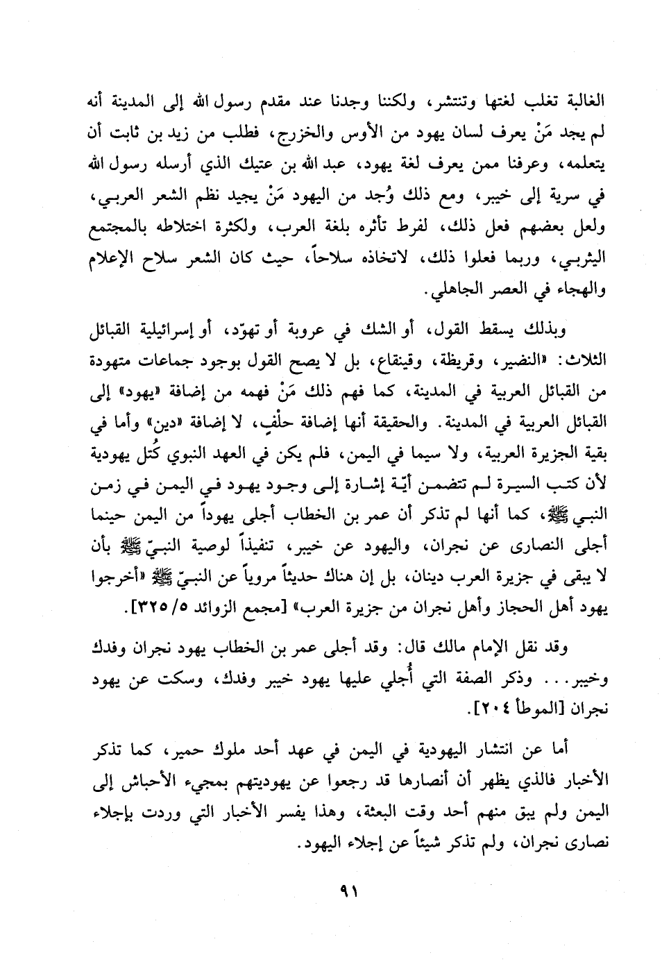 91…الغابة تغلب لغتها وتنتشر، ولكننا وجدنا عند مقدم رسول الله إلى المدينة أنه لم يجد من يعرف لسان يهود من الأوس والخزرج، فطلب من زيد بن ثابت أن يتعلمه، وعرفنا ممن يعرف لغة يهود، عبد الله بن عتيك الذي أرسله رسول الله في سرية إلى خيبر، ومع ذلك وجد من اليهود من يجيد نظم الشعر العربي، ولعل بعضهم فعل ذلك، لفرط تأثره بلغة العرب، ولكثرة اختلاطه بالمجتمع اليثربي، وربما فعلوا ذلك، لاتخاذه سلاحاً، حيث كان الشعر سلاح الإعلام والهجاء في العصر الجاهلي.