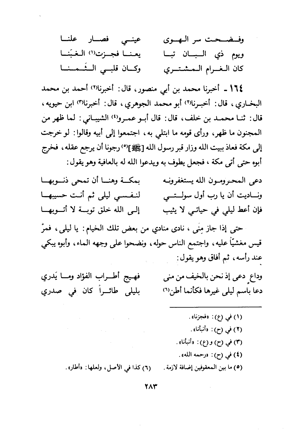 164- أخبرنا محمد بن أبي منصور، قال: أخبرنا أحمد بن محمد البخاري، قال: أخبرنا أبو محمد الجوهري، قال: أخبرنا ابن حيويه، قال: ثنا مُحَمَّدُ بْنُ خَلَفٍ، قَالَ: قَالَ أَبُو عَمْرٍو الشيباني: لما ظهر من المجنون مَا ظَهَرَ، وَرَأَى قَوْمَهُ مَا ابْتُلِيَ بِهِ، اجتمعوا إلى أبيه وقالوا: لو خرجت إِلَى مَكَّةَ فَعَاذَ بِبَيْتِ اللَّهِ وَزَارَ قَبْرَ رَسُولِ اللَّهِ [صَلَّى اللَّهُ عَلَيْهِ وَسَلَّمَ] رَجَوْنَا أن يرجع عقله، فخرج أَبُوهُ حَتَّى أَتَى مَكَّةَ، فَجَعَلَ يَطُوفُ بِهِ ويدعوا الله له بالعافية وهو يقول: