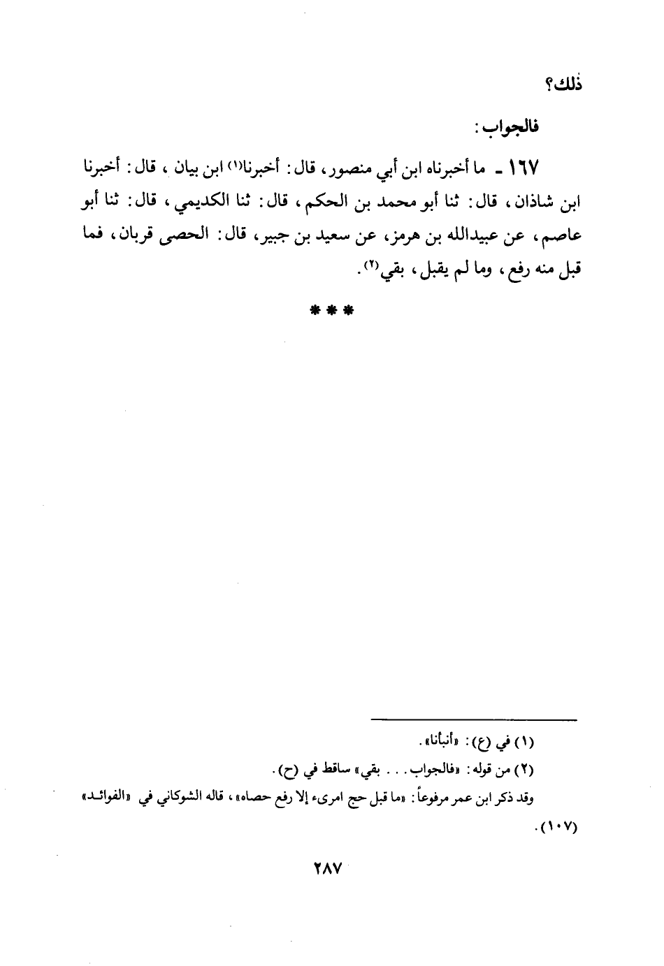 167- ما أخبرناه ابن أبي منصور، قال: أخبرنا ابن بيان، قال: أخبرنا ابن شاذان، قال: ثنا أبو محمد بن الحكم، قال: ثنا الكديمي، قال: ثنا أبو عاصم، عن عبيد اللَّهِ بْنِ هُرْمُزٍ، عَنْ سَعِيدِ بْنِ جُبَيْرٍ، قَالَ: الْحَصَى قُرْبَانٌ، فَمَا قُبِلَ مِنْهُ رُفِعَ، وما لم يقبل، بقي.