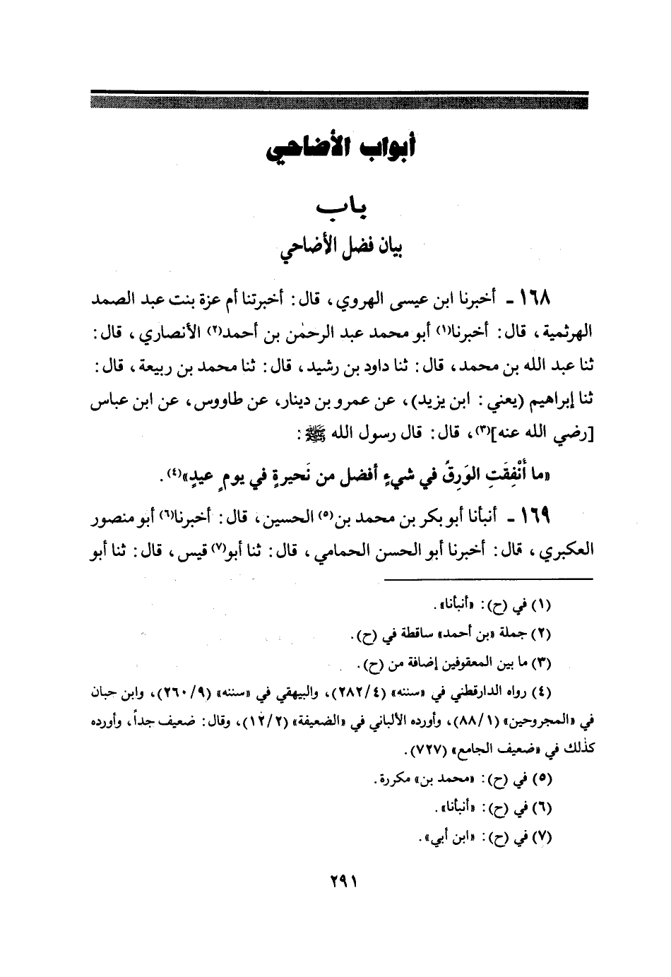 168- أَخْبَرَنَا ابْنُ عِيسَى الْهَرَوِيُّ، قال: أخبرتنا أم عزة بنت عبد الصمد الهرثمية، قال: أخبرنا أَبُو مُحَمَّدٍ عَبْدُ الرَّحْمَنِ بْنُ أَحْمَدَ الأَنْصَارِيُّ، قال: ثنا عبد الله بن محمد، قال: ثنا داود بن رشيد، قال: ثنا محمد بن ربيعة، قال: ثنا إِبْرَاهِيمُ (يَعْنِي: ابْنَ يَزِيدَ) ، عَنْ عَمْرِو بْنِ دينار، عن طاووس، عن ابن عباس [رَضِيَ اللَّهُ عَنْهُ] ، قَالَ: قَالَ رَسُولُ اللَّهِ صَلَّى اللَّهُ عَلَيْهِ وَسَلَّمَ: