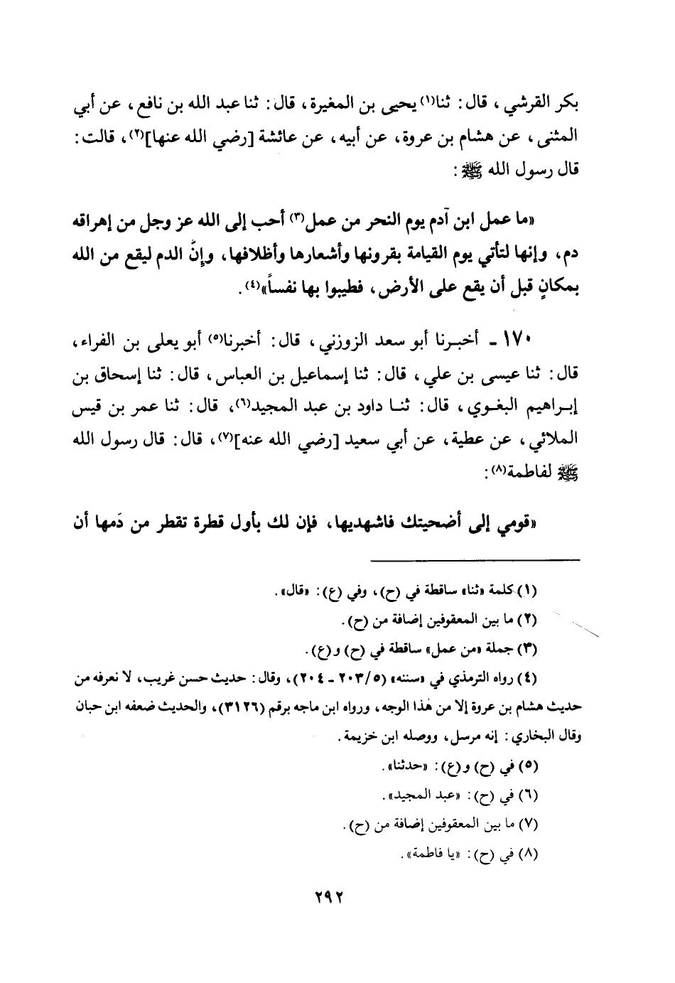 170- أخبرنا أبو سعد الزوزني، قال: أخبرنا أبو يعلى بن الفراء، قال: ثنا عيسى بن علي، قال: ثنا إسماعيل بن العباس، قال: ثنا إسحاق بن إبراهيم البغوي، قال: ثنا داود بن عبد المجيد، قال: ثنا عمر بْنُ قَيْسٍ الْمَلائِيُّ، عَنْ عَطِيَّةَ، عَنْ أَبِي سعيد [رَضِيَ اللَّهُ عَنْهُ] ، قَالَ: قَالَ رَسُولُ اللَّهِ صلى الله عليه وسلم لفاطمة: