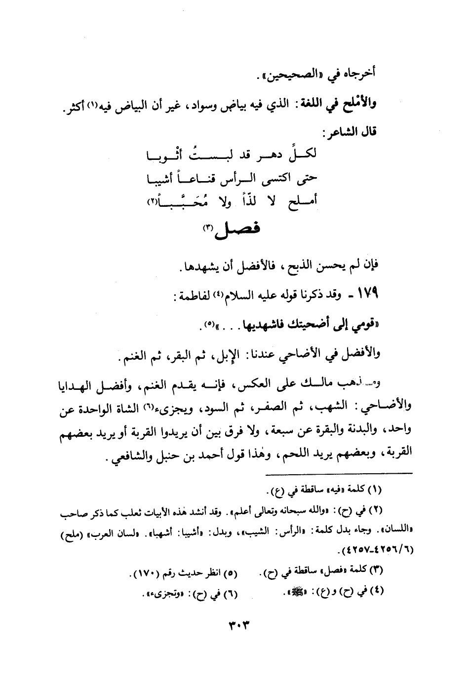 وَمَذْهَبُ مالك على العكس، فإنه يقدم الغنم، وأفضل الْهَدَايَا وَالأَضَاحِي: الشُّهُبُ، ثُمَّ الصُّفُرُ، ثُمَّ السُّودُ، ويجزئ الشَّاةُ الْوَاحِدَةُ عَنْ وَاحِدٍ، وَالْبَدَنَةُ وَالْبَقَرَةُ عَنْ سَبْعَةٍ، وَلا فَرْقَ بَيْنَ أَنْ يُرِيدُوا الْقُرْبَةَ أو يريد بعضهم القربة، وبعضهم يريد اللحم، وهذا قَوْلُ أَحْمَدَ بْنِ حَنْبَلٍ وَالشَّافِعِيِّ.