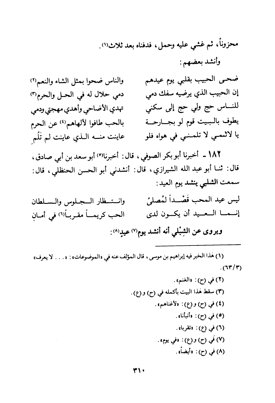 182- أخبرنا أبو بكر الصوفي، قال: أخبرنا أبو سعد بن أبي صادق، قال: ثنا أَبُو عَبْدِ اللَّهِ الشِّيرَازِيُّ، قَالَ: أَنْشَدَنِي أَبُو الحسن الحنظلي، قال: سمعت الشلبي ينشد يوم العيد: