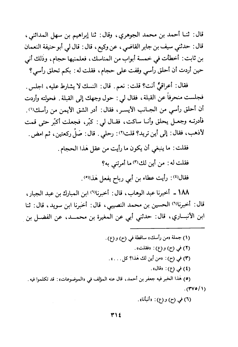 قال: ثنا أحمد بن محمد الجوهري، وقال: ثنا إبراهيم بن سهل المدائني، قال: حَدَّثَنِي سَيْفُ بْنُ جَابِرٍ الْقَاضِي، عَنْ وَكِيعٍ، قَالَ: قَالَ لِي أَبُو حَنِيفَةَ النُّعْمَانُ بْنُ ثابت: أَخْطَأْتُ فِي خَمْسَةِ أَبْوَابٍ مِنَ الْمَنَاسِكِ، فَعَلَّمَنِيهَا حَجَّامٌ، وَذَلِكَ أَنِّي حِينَ أَرَدْتُ أَنْ أَحْلِقَ رأسي وقفت عَلَيَّ حَجَّامٌ، فَقُلْتُ لَهُ: بِكَمْ تَحْلِقُ رَأْسِي؟
