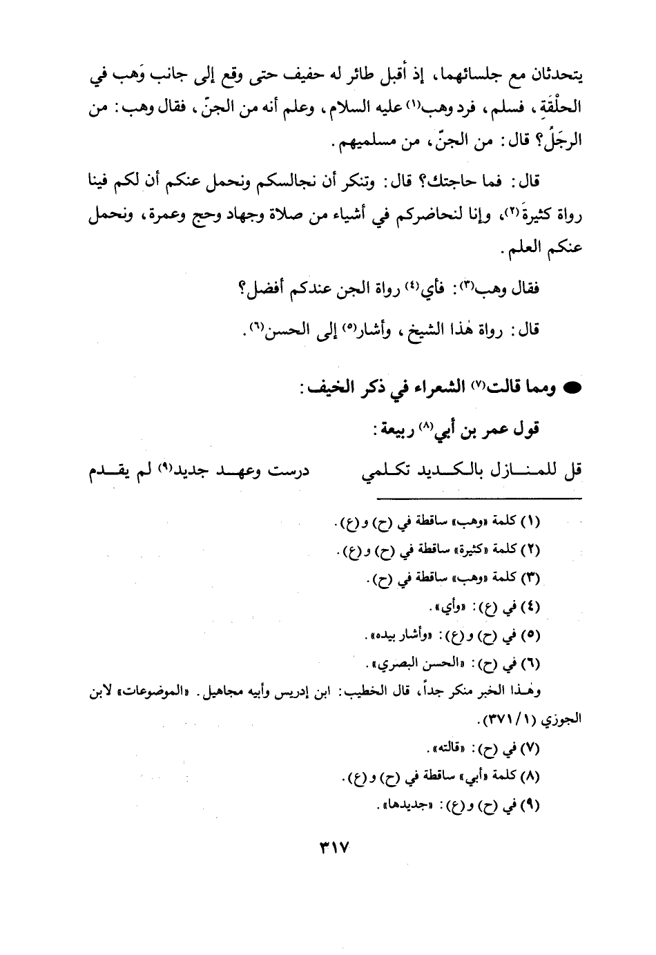 يَتَحَدَّثَانِ مَعَ جُلَسَائِهِمَا، إِذْ أَقْبَلَ طَائِرٌ لَهُ حَفِيفٌ حَتَّى وَقَعَ إِلَى جَانِبِ وَهْبٍ فِي الْحَلَقَةِ، فَسَلَّمَ، فَرَدَّ وَهْبٌ عَلَيْهِ السَّلامَ، وَعَلِمَ أنه من الجن، فقال وهب: من الرجل؟ قال: مِنَ الْجِنِّ، مِنْ مُسْلِمِيهِمْ.