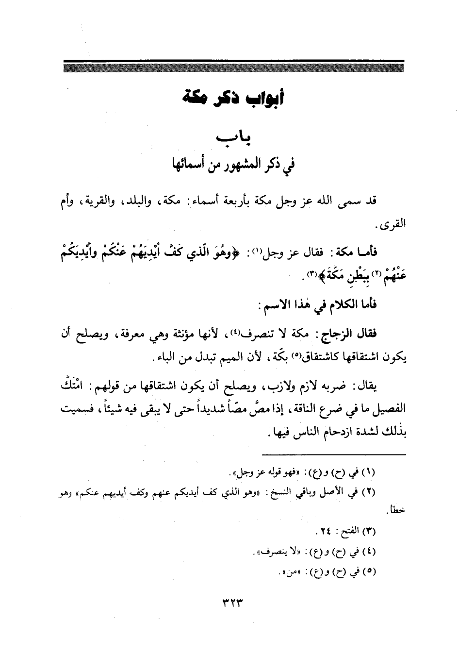 فقال الزجاج: مكة لا تنصرف، لأَنَّهَا مُؤَنَّثَةٌ وَهِيَ مَعْرِفَةٌ، وَيَصْلُحُ أَنْ يَكُونَ اشتقاقها كاشتقاق بكة، لأن الميم تبدل من الْبَاءِ.