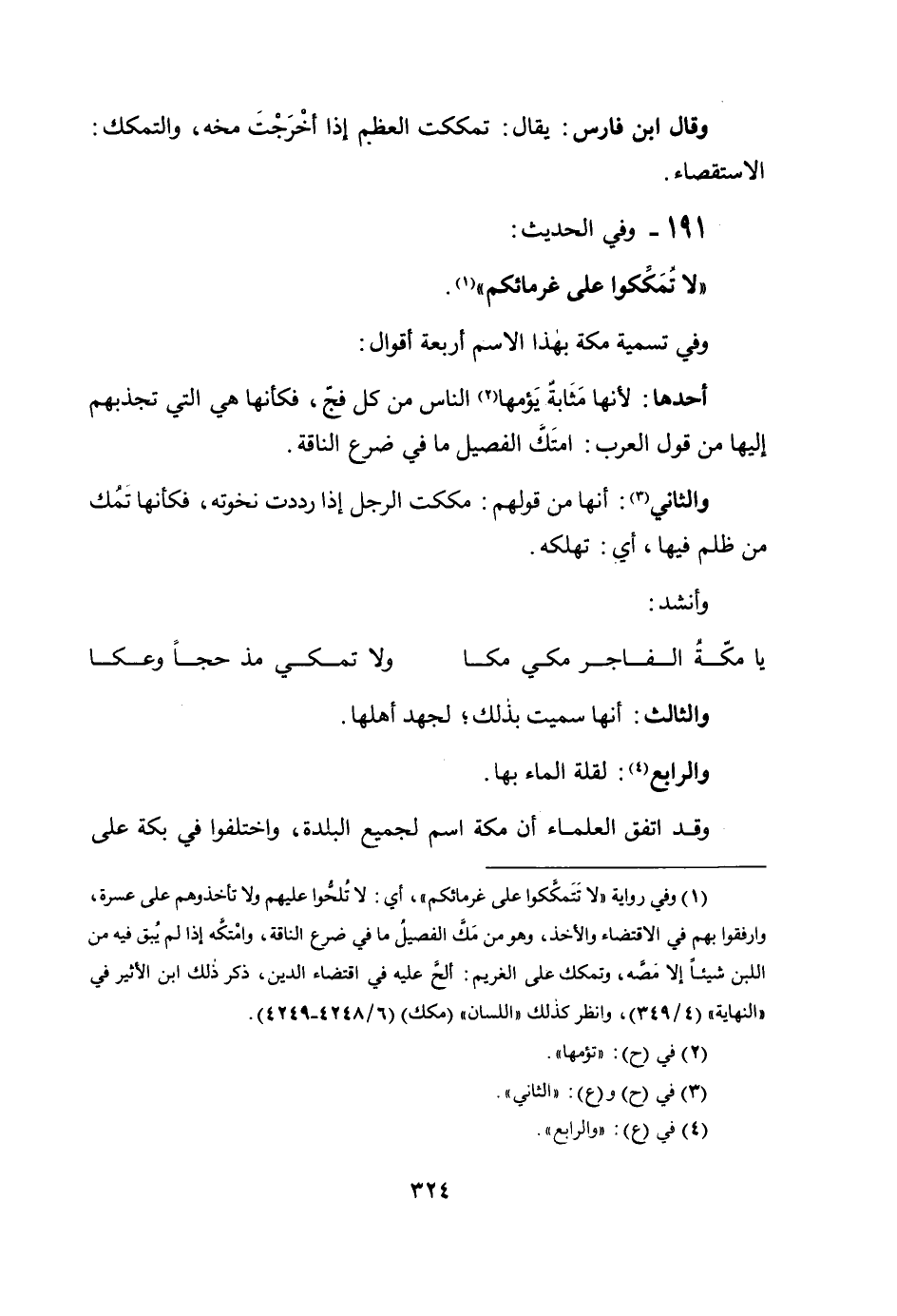 وَفِي تَسْمِيَةِ مَكَّةَ بِهَذَا الاسْمِ أَرْبَعَةُ أَقْوَالٍ: