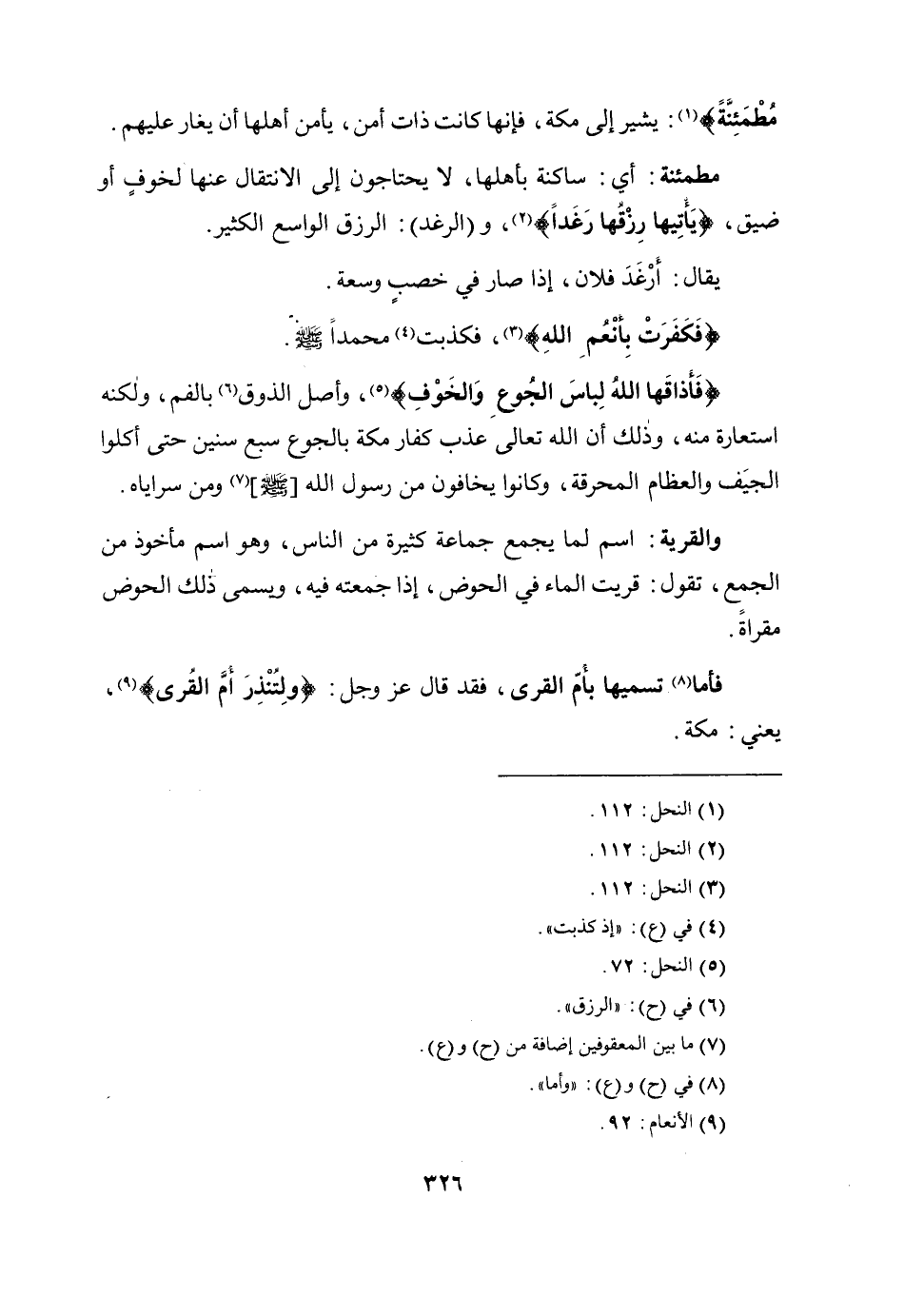 مطمئنةً} : يُشِيرُ إِلَى مَكَّةَ، فَإِنَّهَا كَانَتْ ذَاتَ أَمْنٍ، يأمن أهلها أن يغار عليهم.